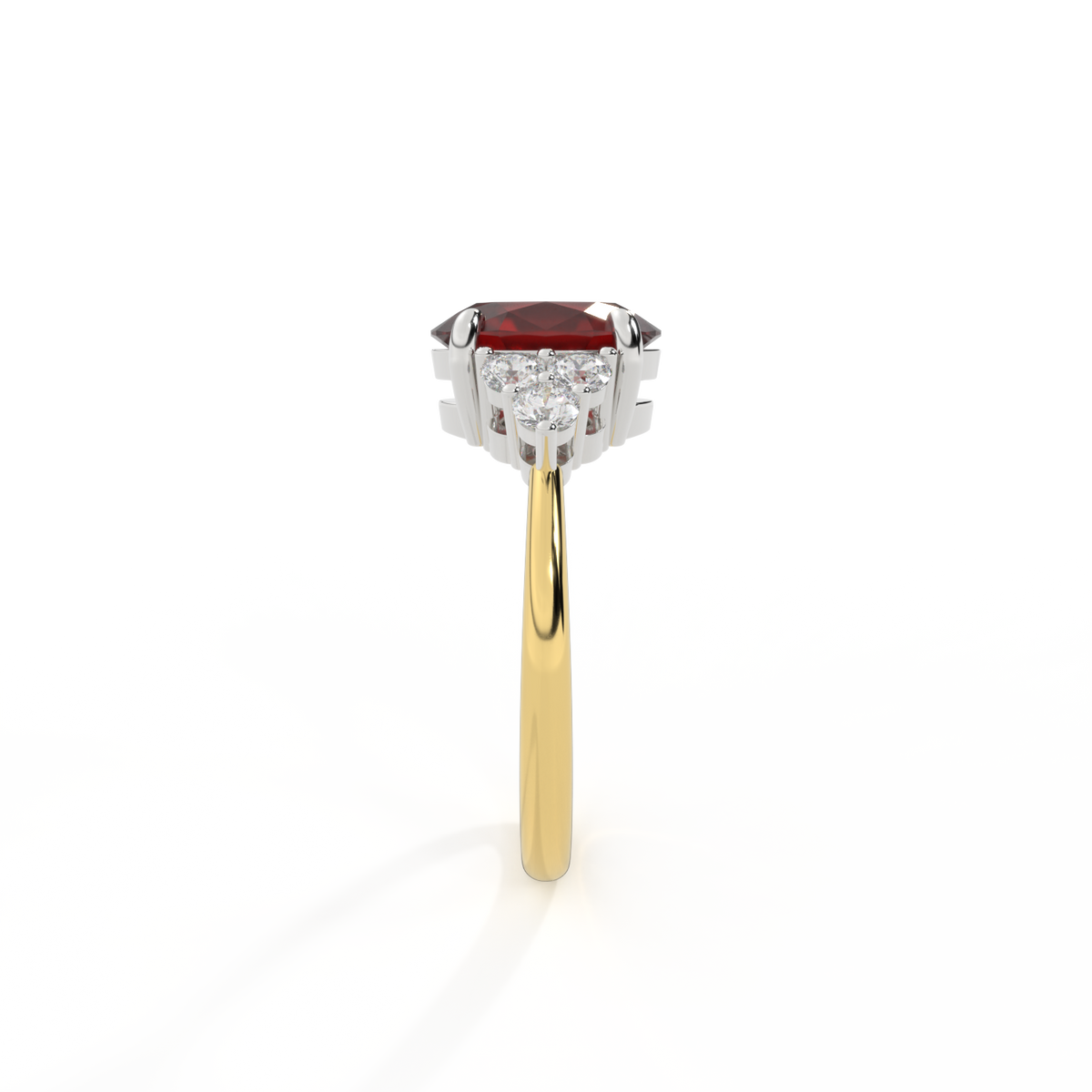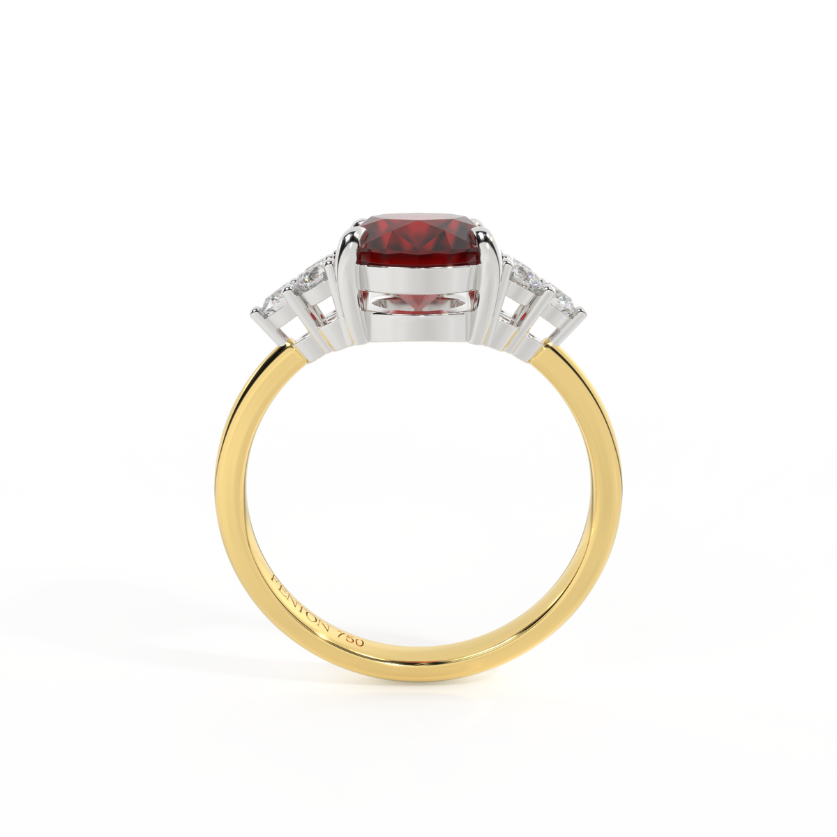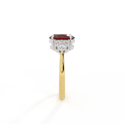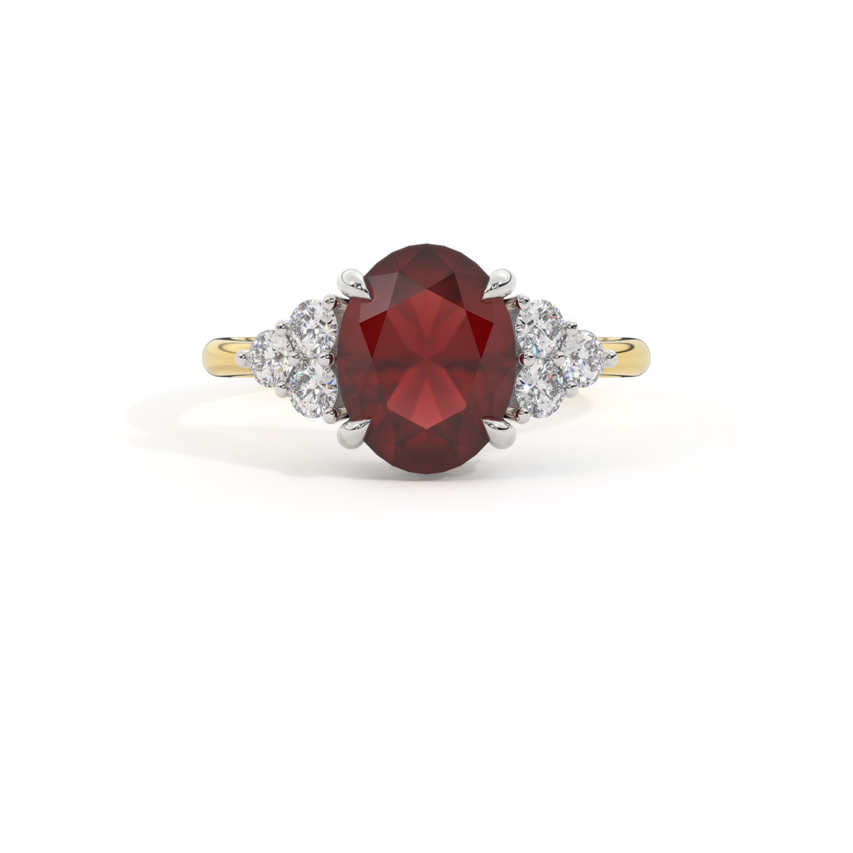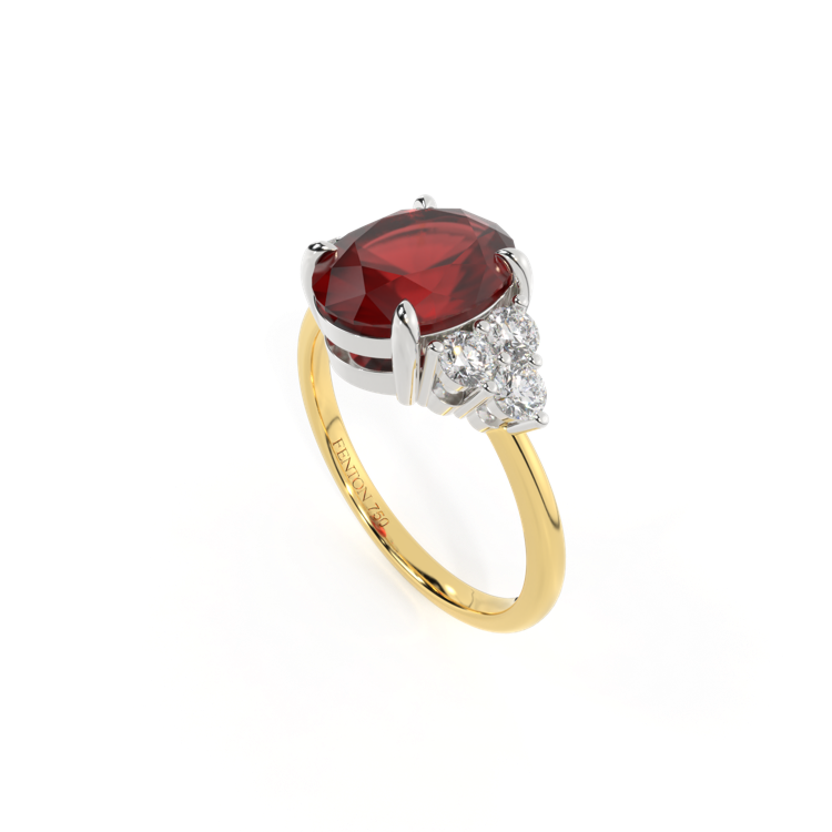 Ihr glitzernder Oval Schliff Granat wird auf beiden Seiten von drei 1,8 mm großen runden Diamanten im Brillantschliff (GH/VS) eingerahmt, die jeweils sicher in einer Krallenfassung gefasst sind. Das Design lenkt den Blick auf den glitzernden Mittelstein Granat, der stolz in einer klassischen, offenen Galerie-Fassung aus massivem, recyceltem 18-karätigem Gold oder Platin sitzt. Die offene Fassung dieses Designs lässt das Licht in alle Richtungen reflektieren und sorgt so für einen glänzenden und funkelnden Look.