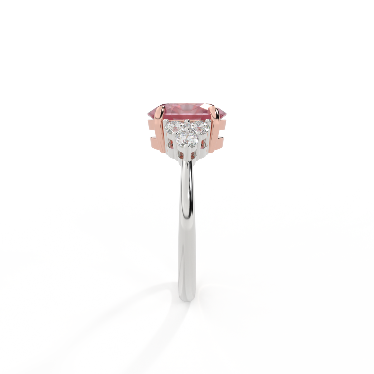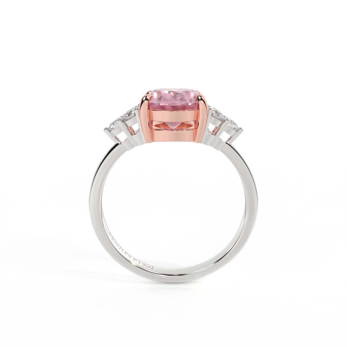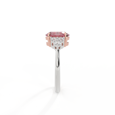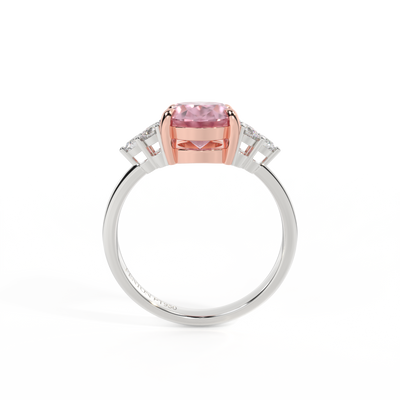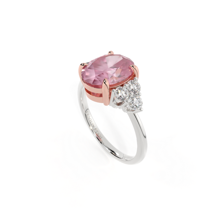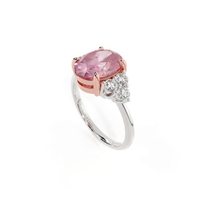 Ihr glitzernder Oval Schliff Rosa Saphir wird auf beiden Seiten von drei 1,8 mm großen runden Diamanten im Brillantschliff (GH/VS) eingerahmt, die jeweils sicher in einer Krallenfassung gefasst sind. Das Design lenkt den Blick auf den glitzernden Mittelstein Rosa Saphir, der stolz in einer klassischen, offenen Galerie-Fassung aus massivem, recyceltem 18-karätigem Gold oder Platin sitzt. Die offene Fassung dieses Designs lässt das Licht in alle Richtungen reflektieren und sorgt so für einen glänzenden und funkelnden Look.