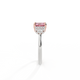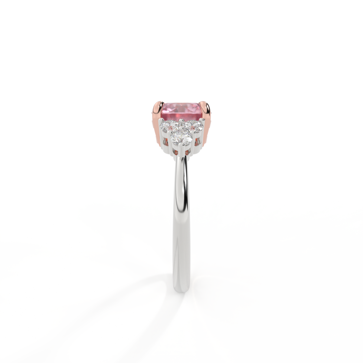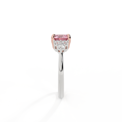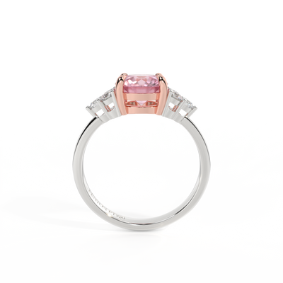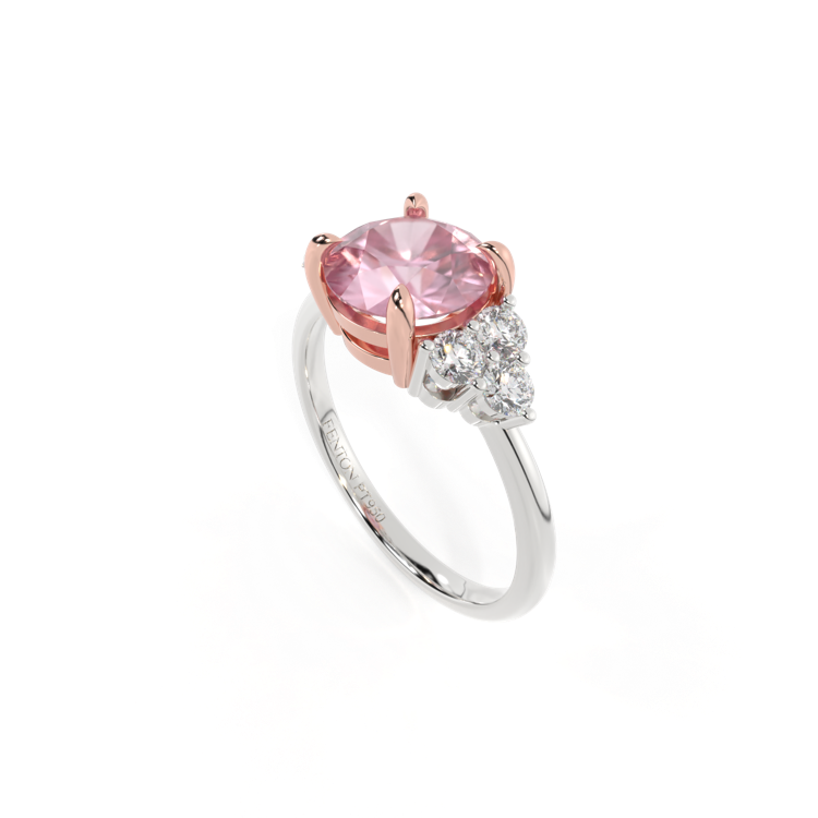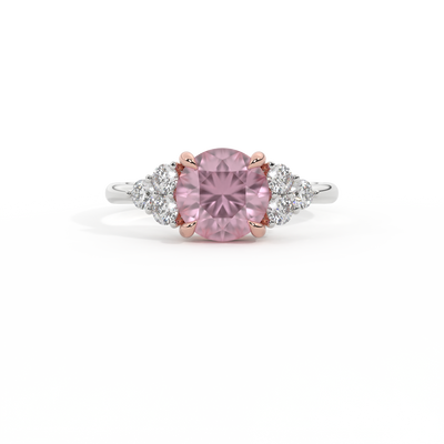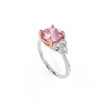 Ihr glitzernder Runden Schliff Rosa Saphir wird auf beiden Seiten von drei 1,8 mm großen runden Diamanten im Brillantschliff (GH/VS) eingerahmt, die jeweils sicher in einer Krallenfassung gefasst sind. Das Design lenkt den Blick auf den glitzernden Mittelstein Rosa Saphir, der stolz in einer klassischen, offenen Galerie-Fassung aus massivem, recyceltem 18-karätigem Gold oder Platin sitzt. Die offene Fassung dieses Designs lässt das Licht in alle Richtungen reflektieren und sorgt so für einen glänzenden und funkelnden Look.