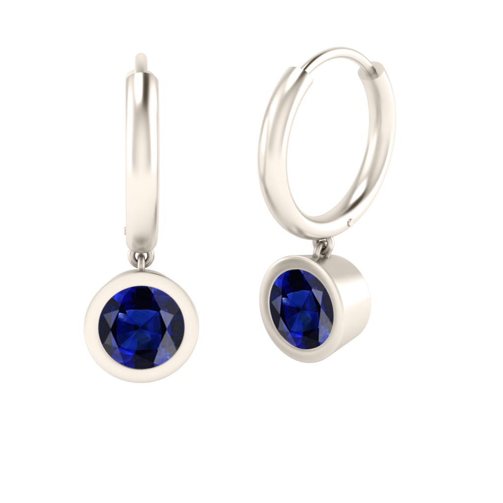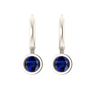 Bezel Drop Round Cut Blue Sapphire 18K White Gold Earrings
