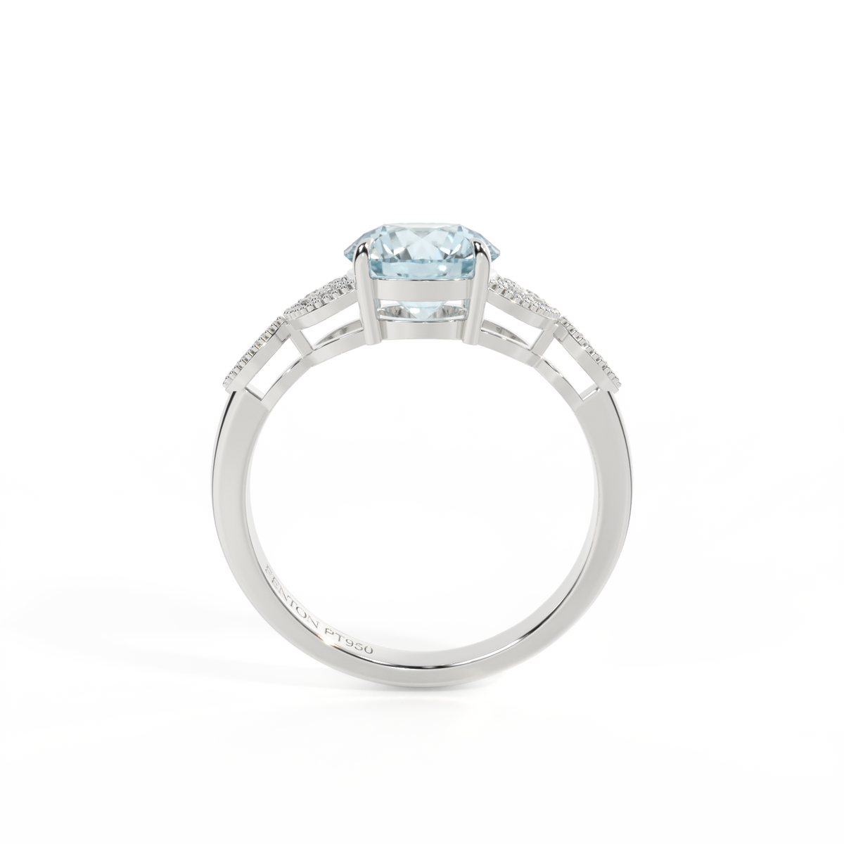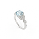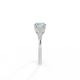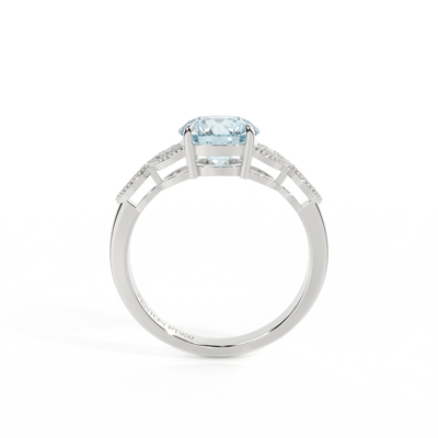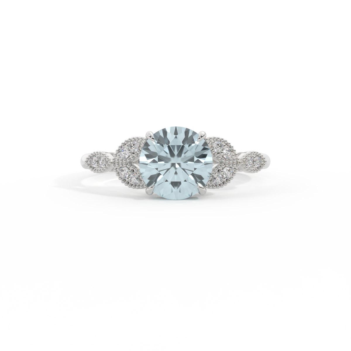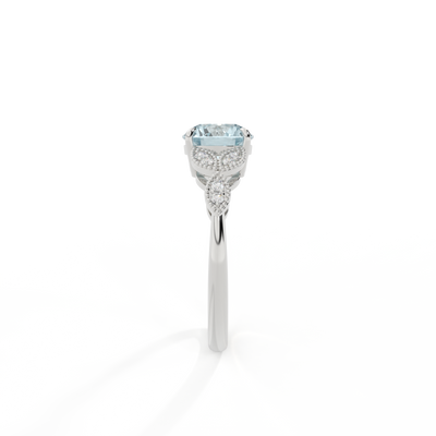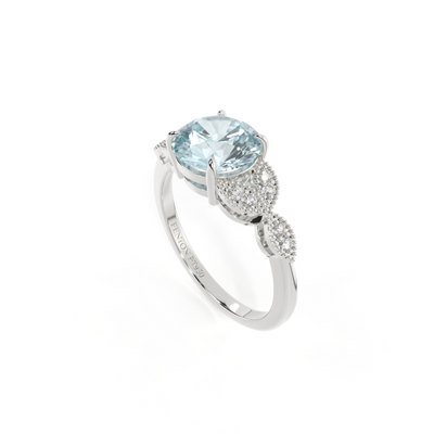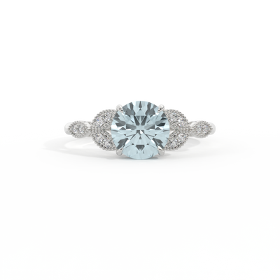 The beauty of a flower, re-imagined for eternity. Inspired by the romance of the Victorian era, this Round cut Aquamarine is accentuated by a duo of delicate diamond-set petals with millegrain detail for an elegant twist on a timeless classic.