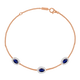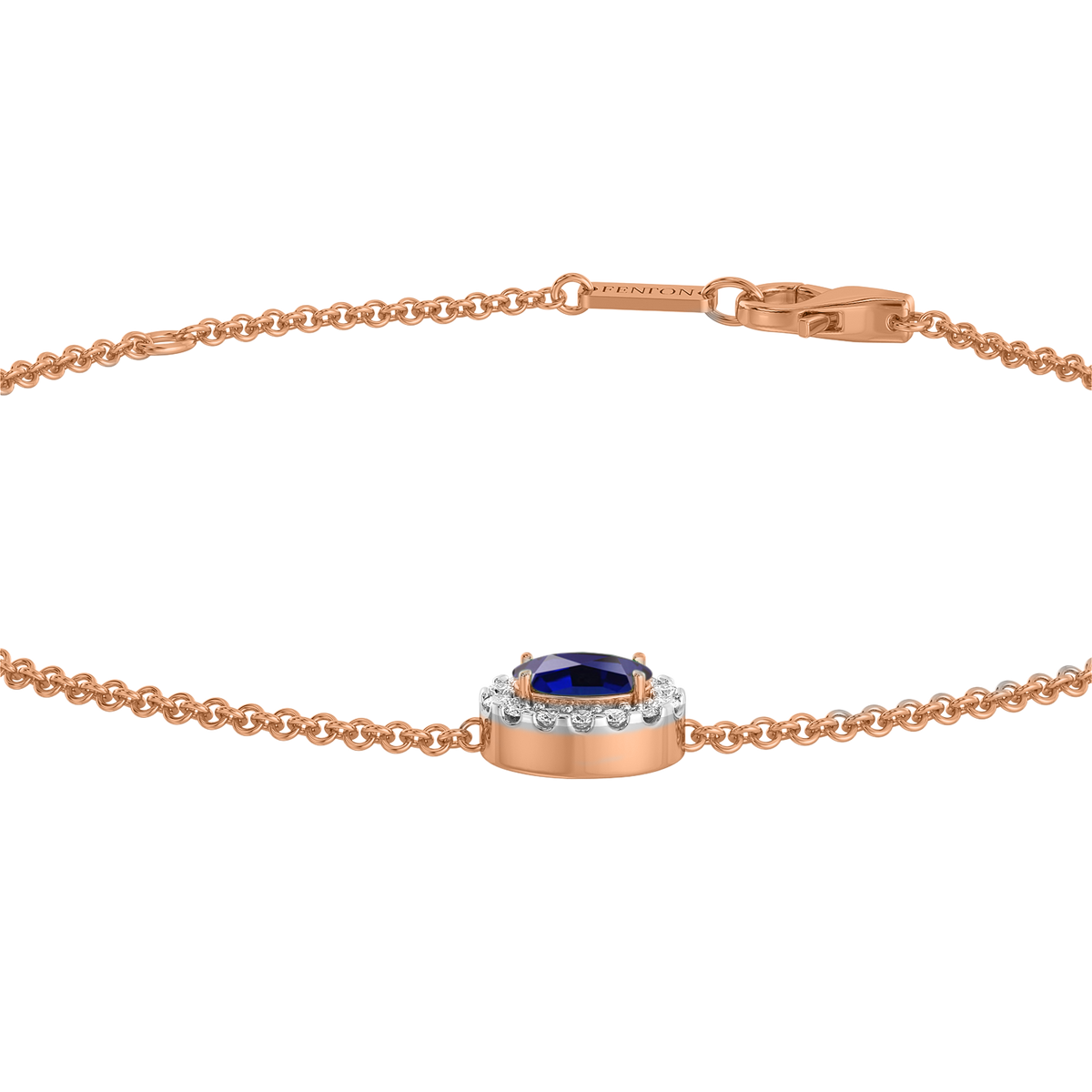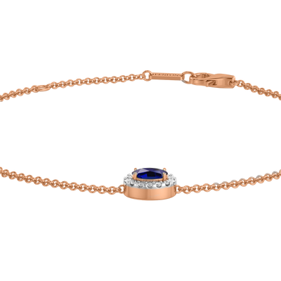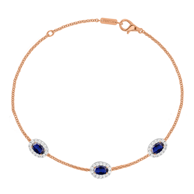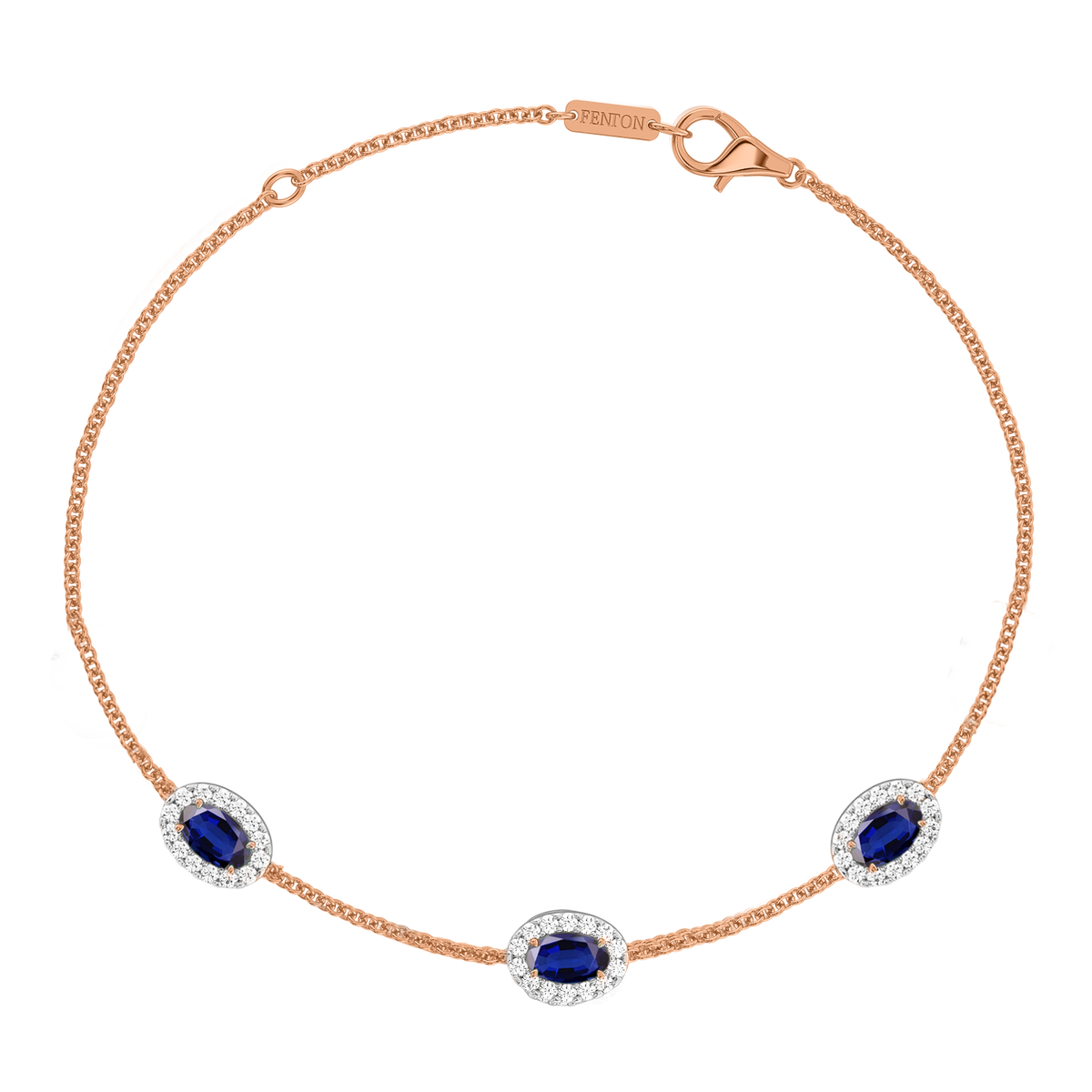 The Garland Bracelet in Blue Sapphire balances feminine romanticism and timeless style. This delicate design features three Oval Blue Sapphire stones in a classic claw setting surrounded by a glistening halo of G/H colour and VS clarity diamonds to create a jewellery piece to be treasured forever. The three-stone design is a Fenton favourite and reminiscent of a floral garland, one of the most universal symbols of love.