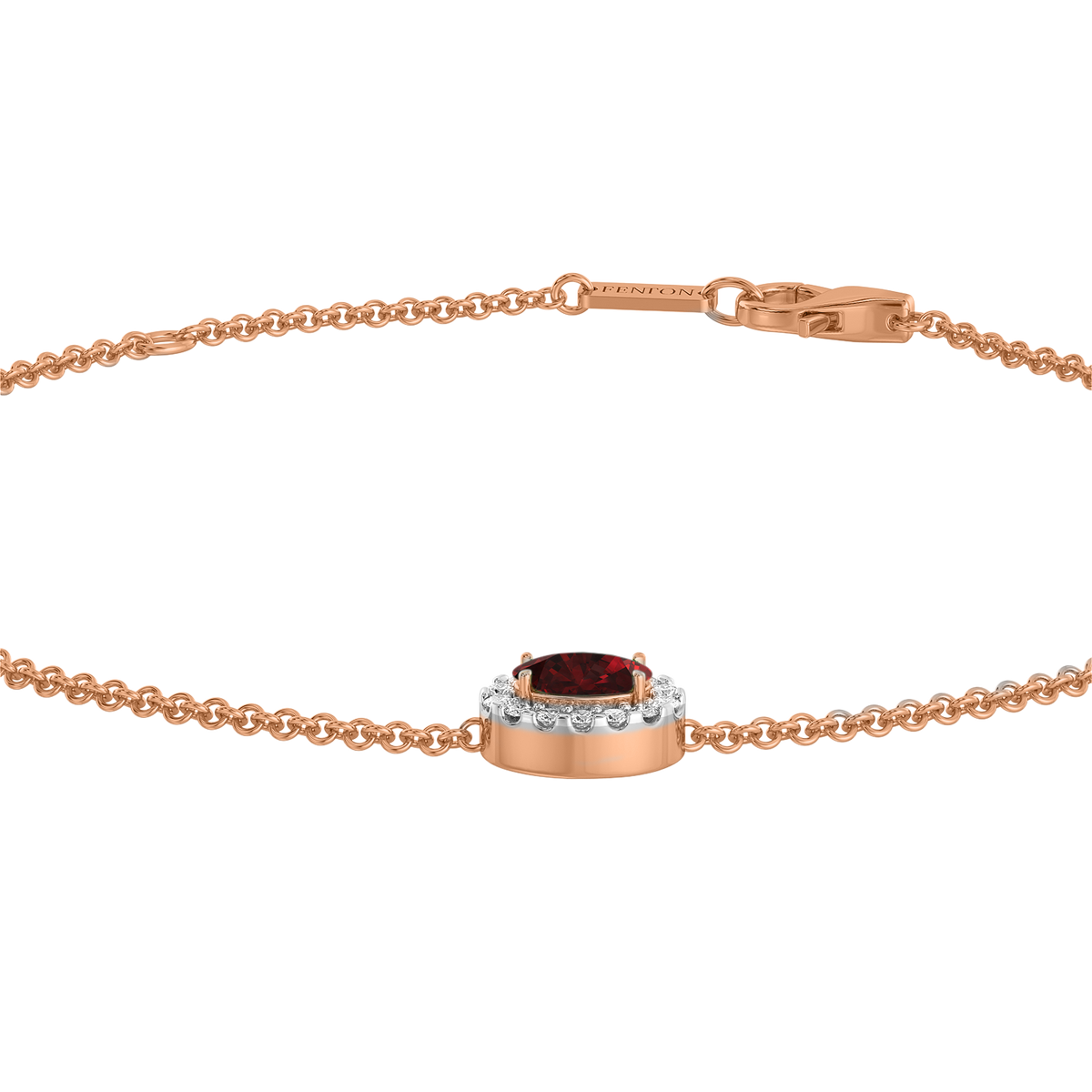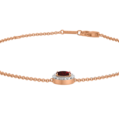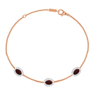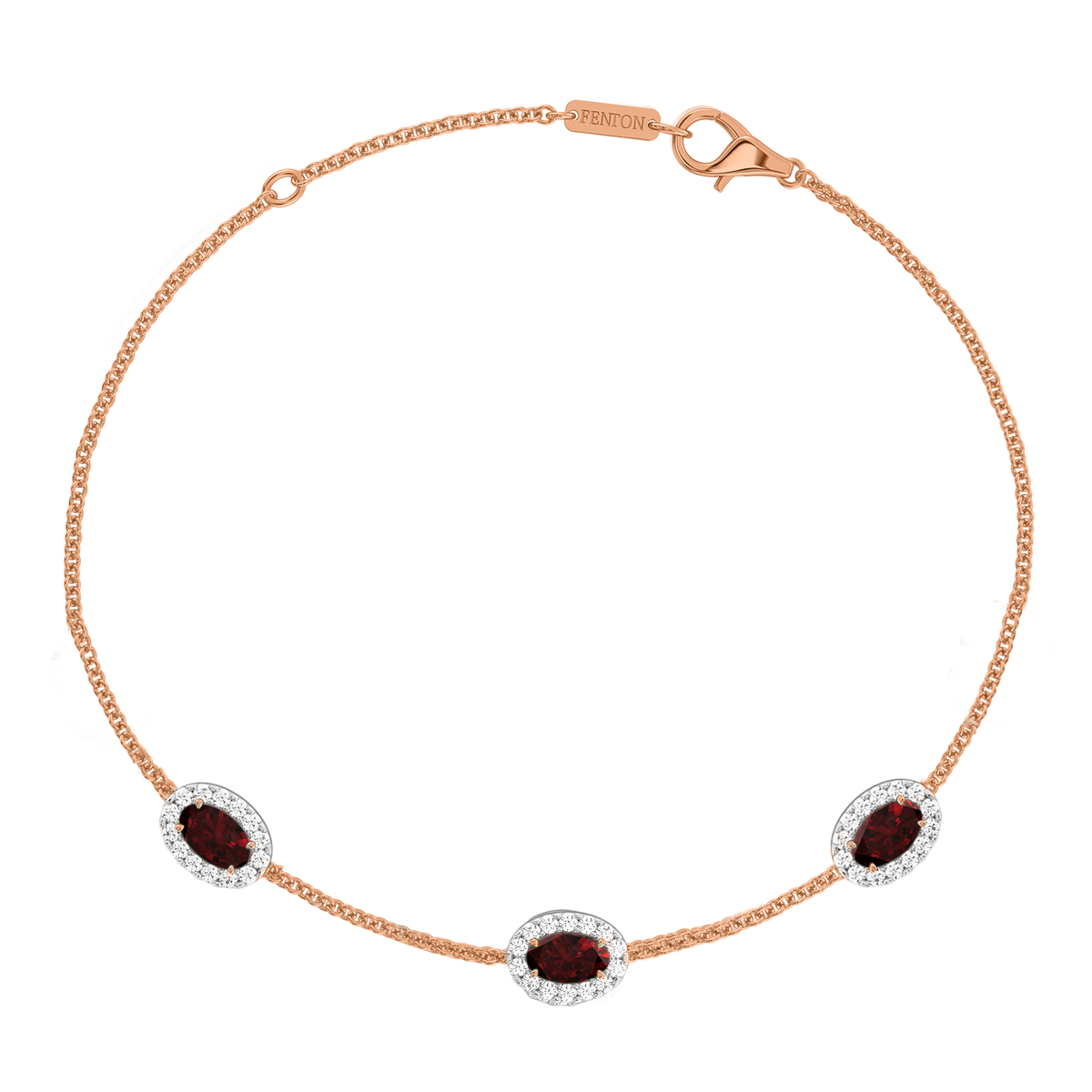 The Garland Bracelet in Garnet balances feminine romanticism and timeless style. This delicate design features three Oval Garnet stones in a classic claw setting surrounded by a glistening halo of G/H colour and VS clarity diamonds to create a jewellery piece to be treasured forever. The three-stone design is a Fenton favourite and reminiscent of a floral garland, one of the most universal symbols of love.