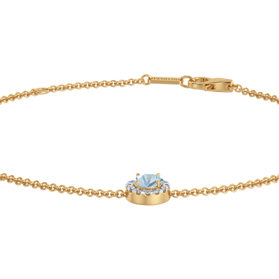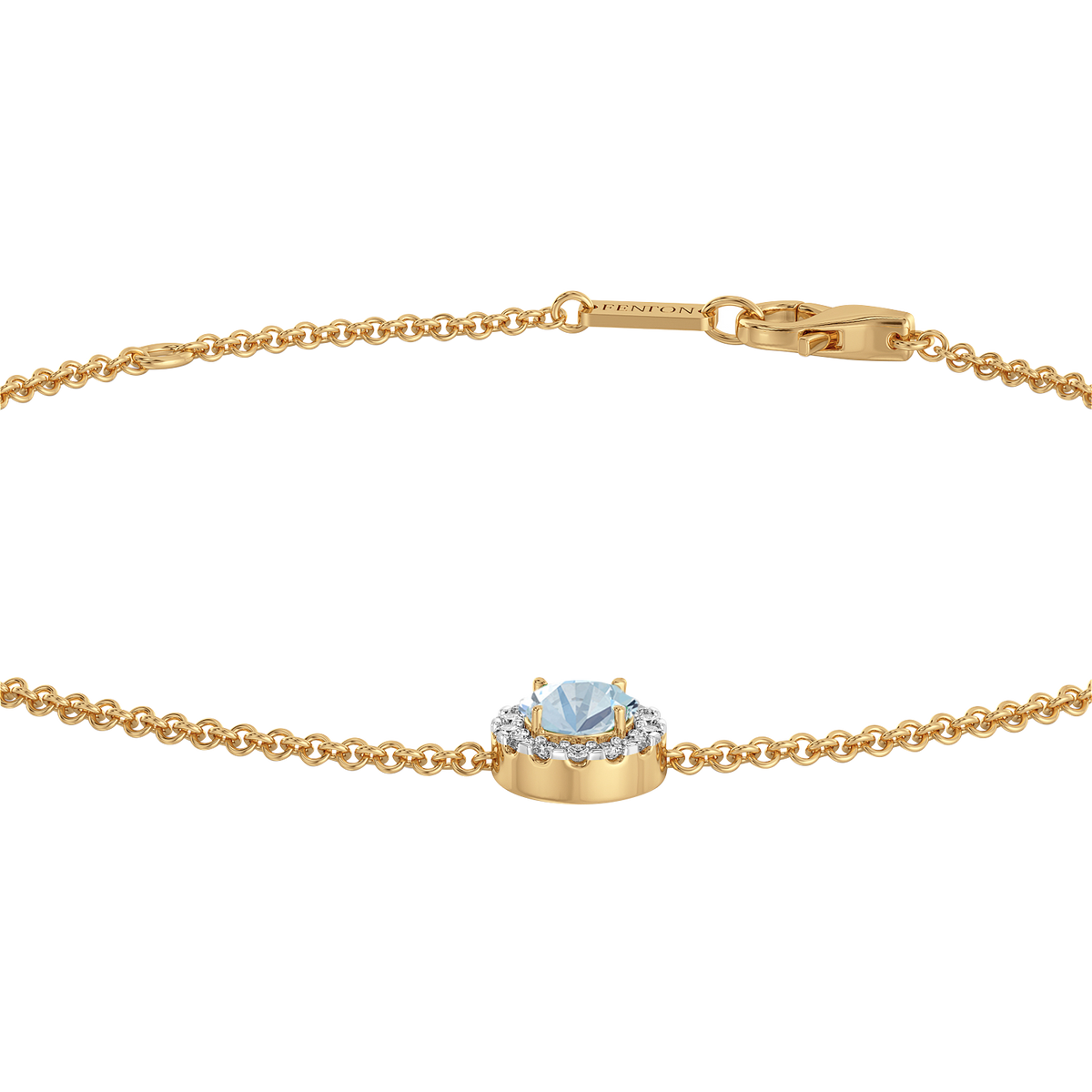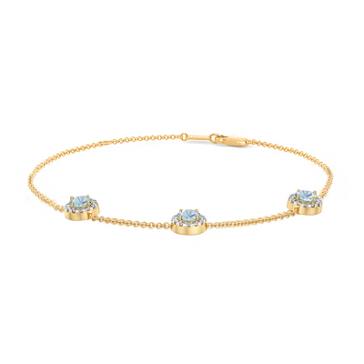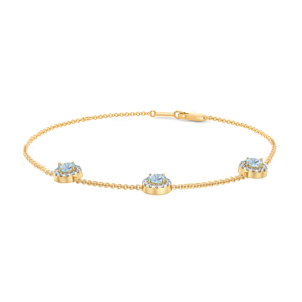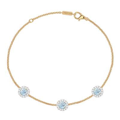 The Garland Bracelet in Aquamarine balances feminine romanticism and timeless style. This delicate design features three Round Aquamarine stones in a classic claw setting surrounded by a glistening halo of G/H colour and VS clarity diamonds to create a jewellery piece to be treasured forever. The three-stone design is a Fenton favourite and reminiscent of a floral garland, one of the most universal symbols of love.