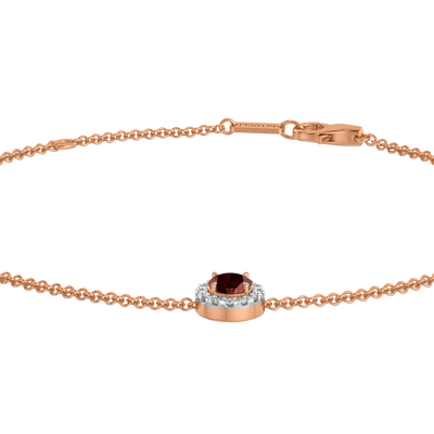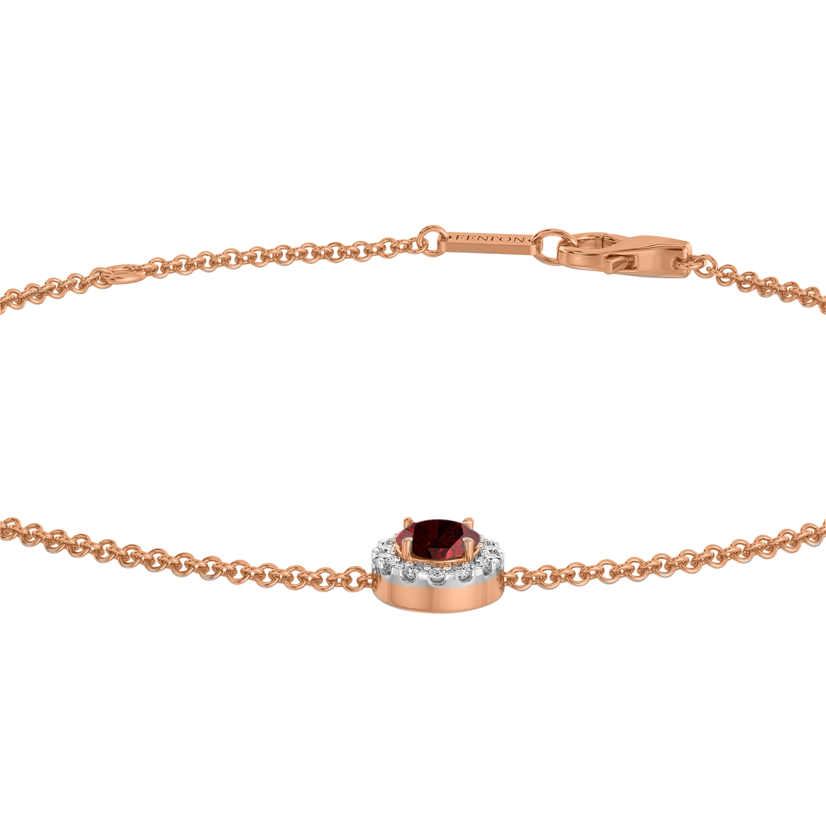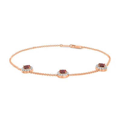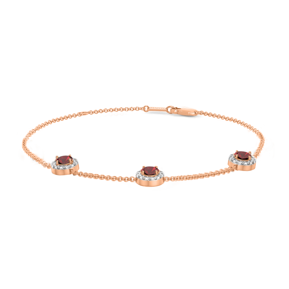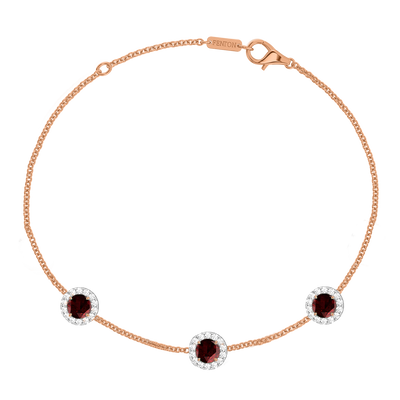 The Garland Bracelet in Garnet balances feminine romanticism and timeless style. This delicate design features three Round Garnet stones in a classic claw setting surrounded by a glistening halo of G/H colour and VS clarity diamonds to create a jewellery piece to be treasured forever. The three-stone design is a Fenton favourite and reminiscent of a floral garland, one of the most universal symbols of love.