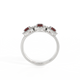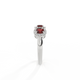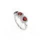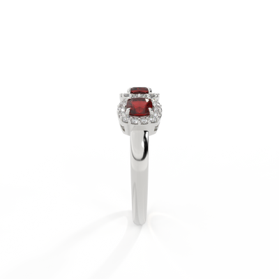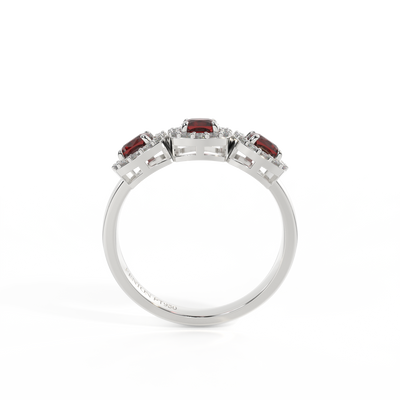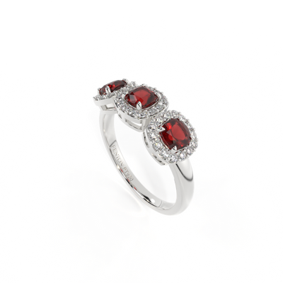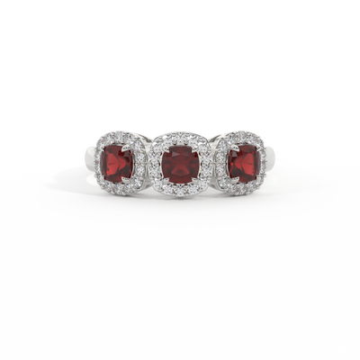 This low set, super wearable beauty, is reminiscent of a floral garland, one of the most universal symbols of love. Three Cushion cut Garnet stones are surrounded by diamond halos, each stone is completely unique.