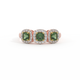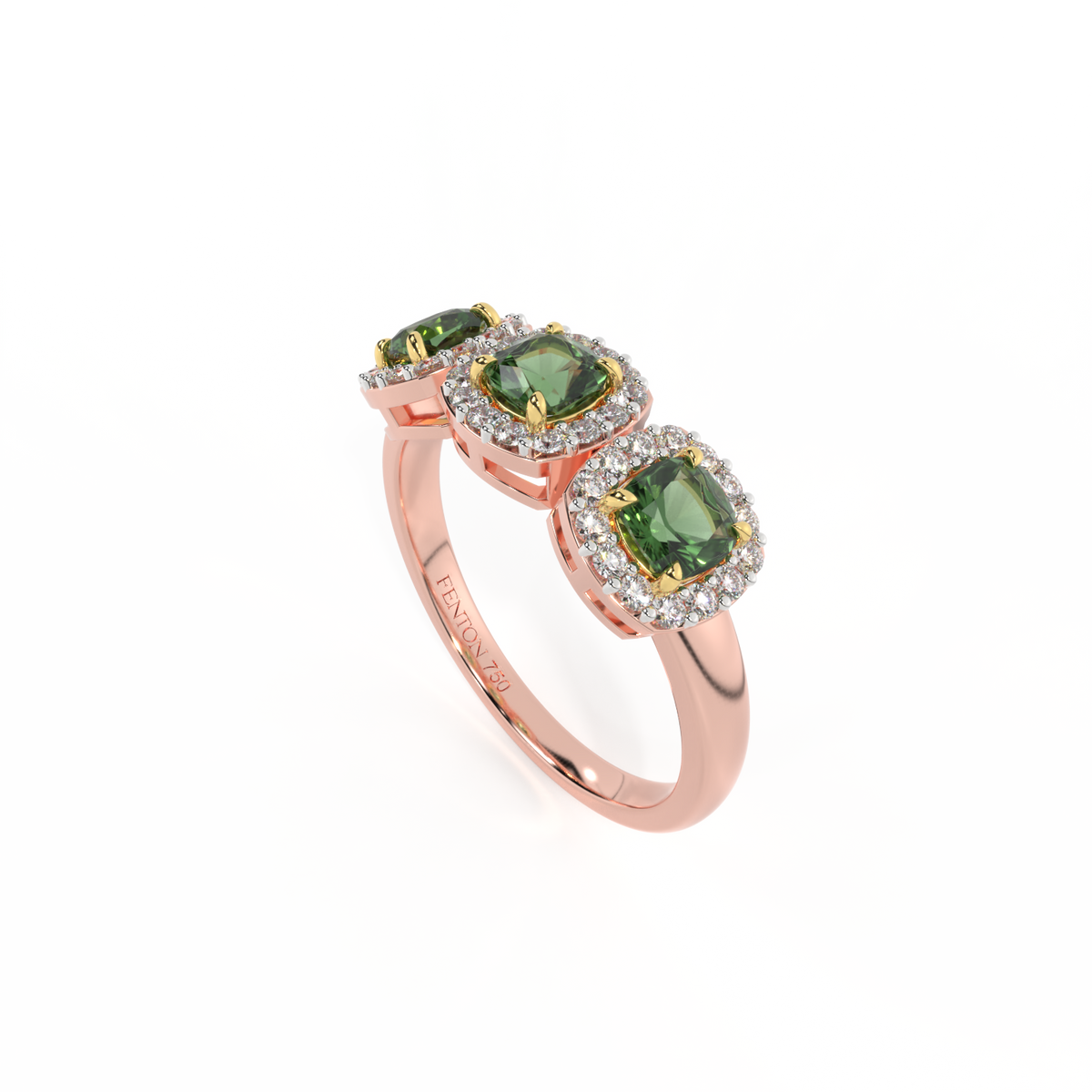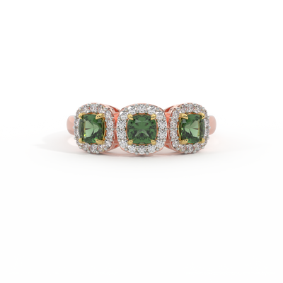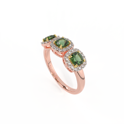 This low set, super wearable beauty, is reminiscent of a floral garland, one of the most universal symbols of love. Three Cushion cut Green Sapphire stones are surrounded by diamond halos, each stone is completely unique.