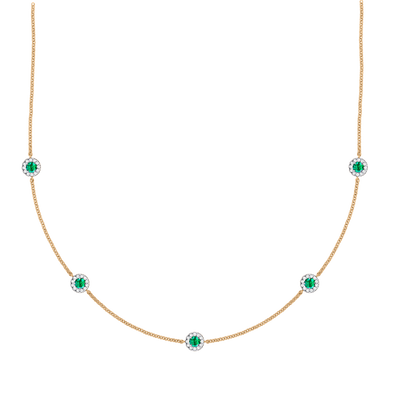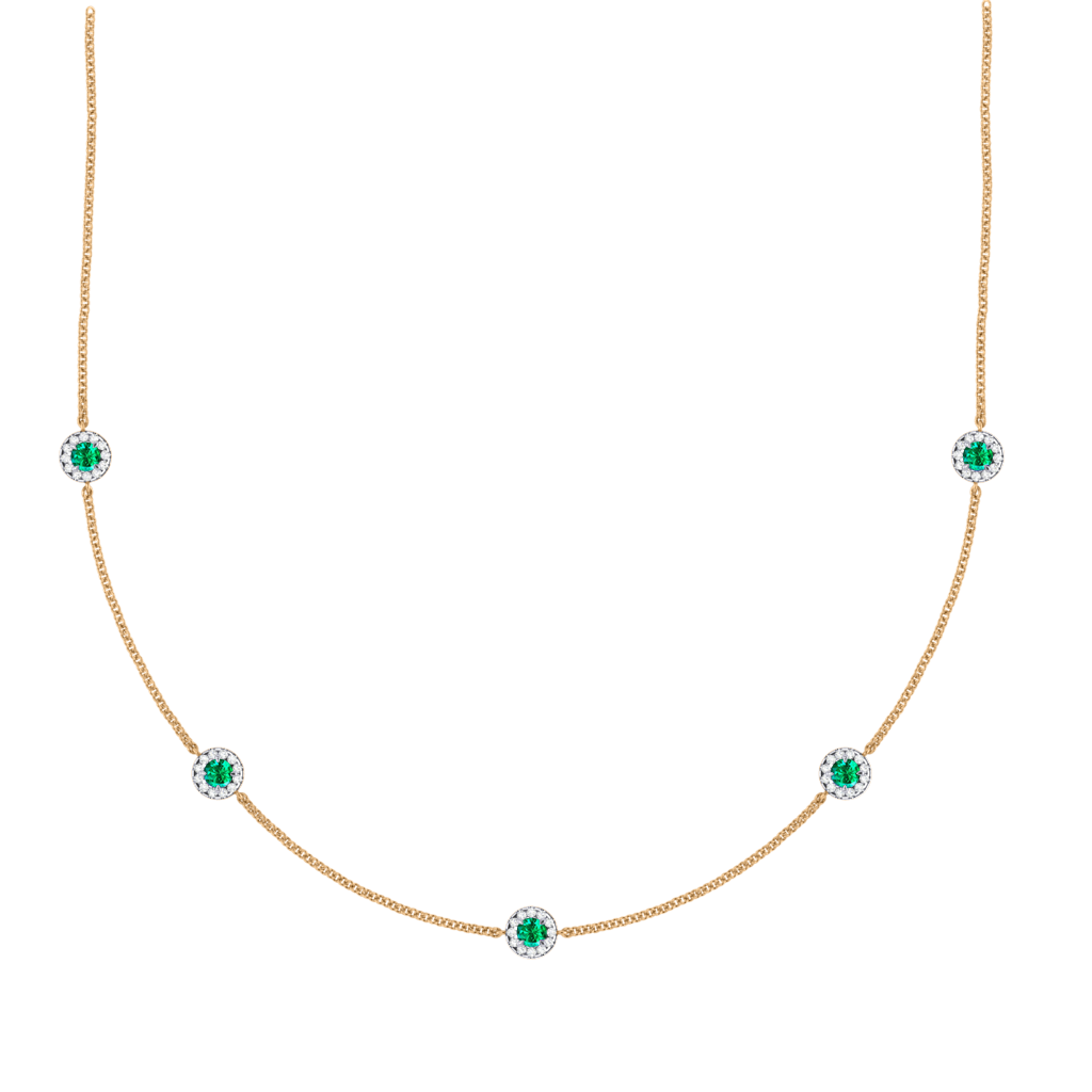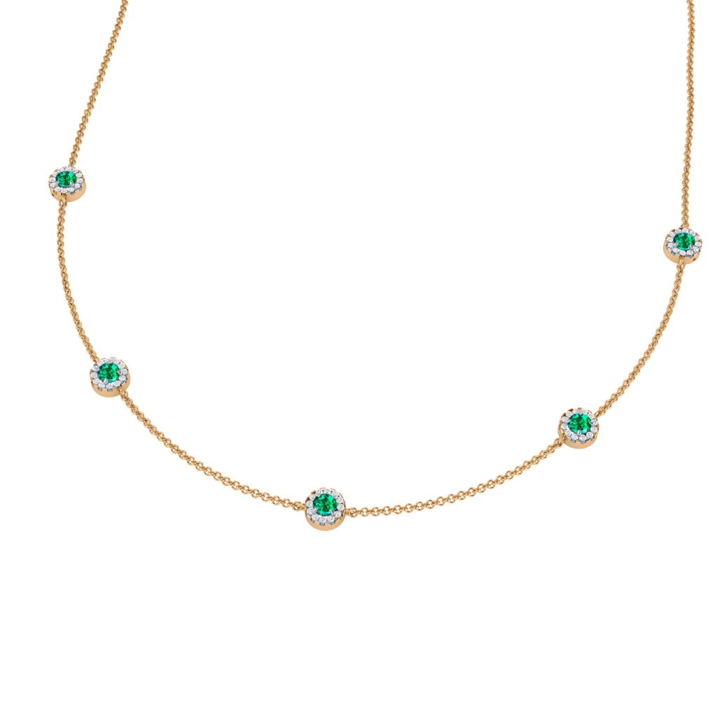 Our Garland Emerald Necklace brings together timeless elegance and glistening gemstones, making you sparkle in every direction. Each of your five Round cut Emerald centre stones are surrounded by an elegant halo of G/H colour and VS clarity diamonds measuring 3mm, each equally spaced to make an effortless, sparkling statement.