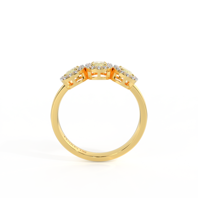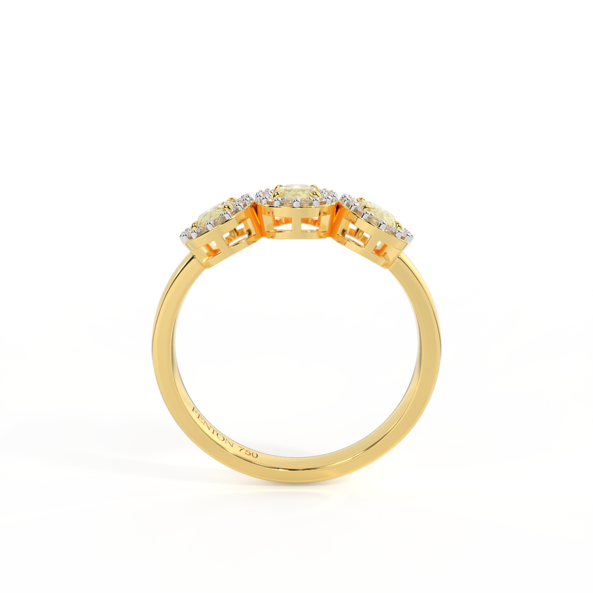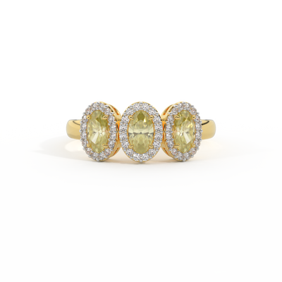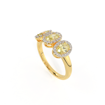 This low set, super wearable beauty, is reminiscent of a floral garland, one of the most universal symbols of love. Three Oval cut Yellow Sapphire stones are surrounded by diamond halos, each stone is completely unique.