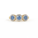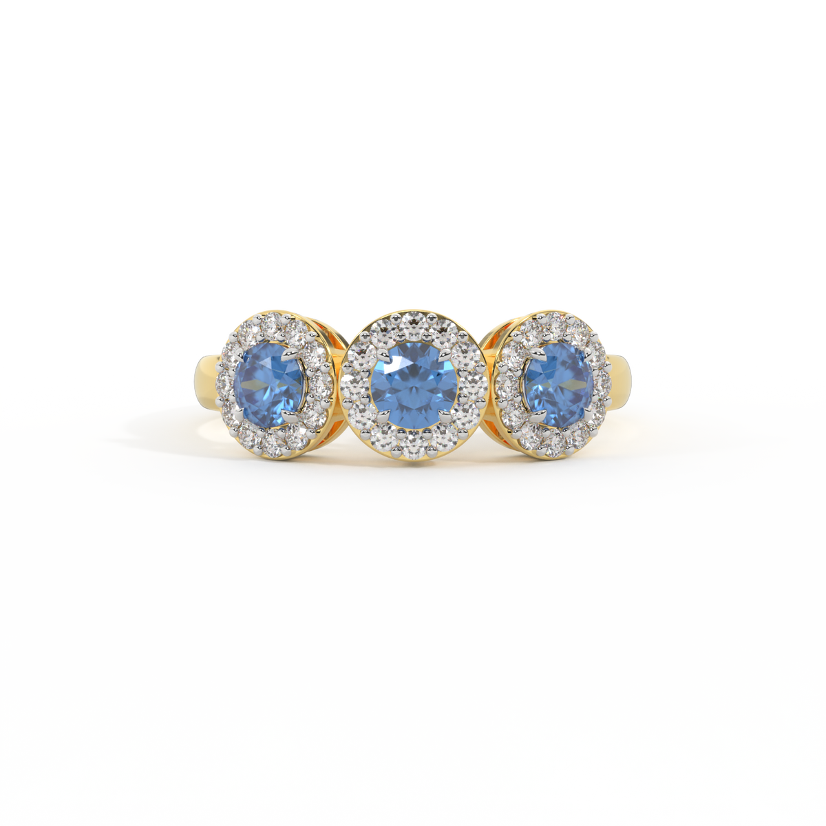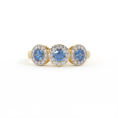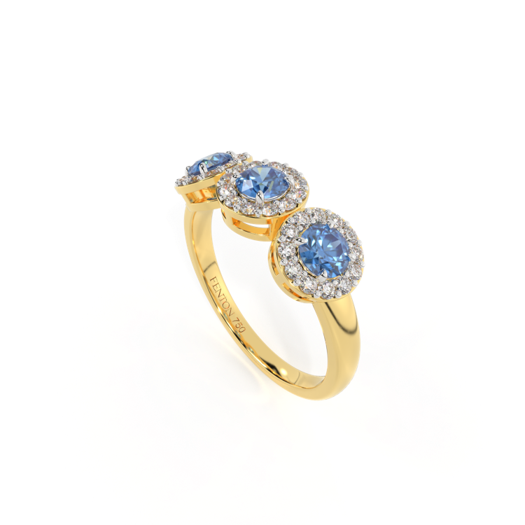 This low set, super wearable beauty, is reminiscent of a floral garland, one of the most universal symbols of love. Three Round cut Blue Sapphire stones are surrounded by diamond halos, each stone is completely unique.