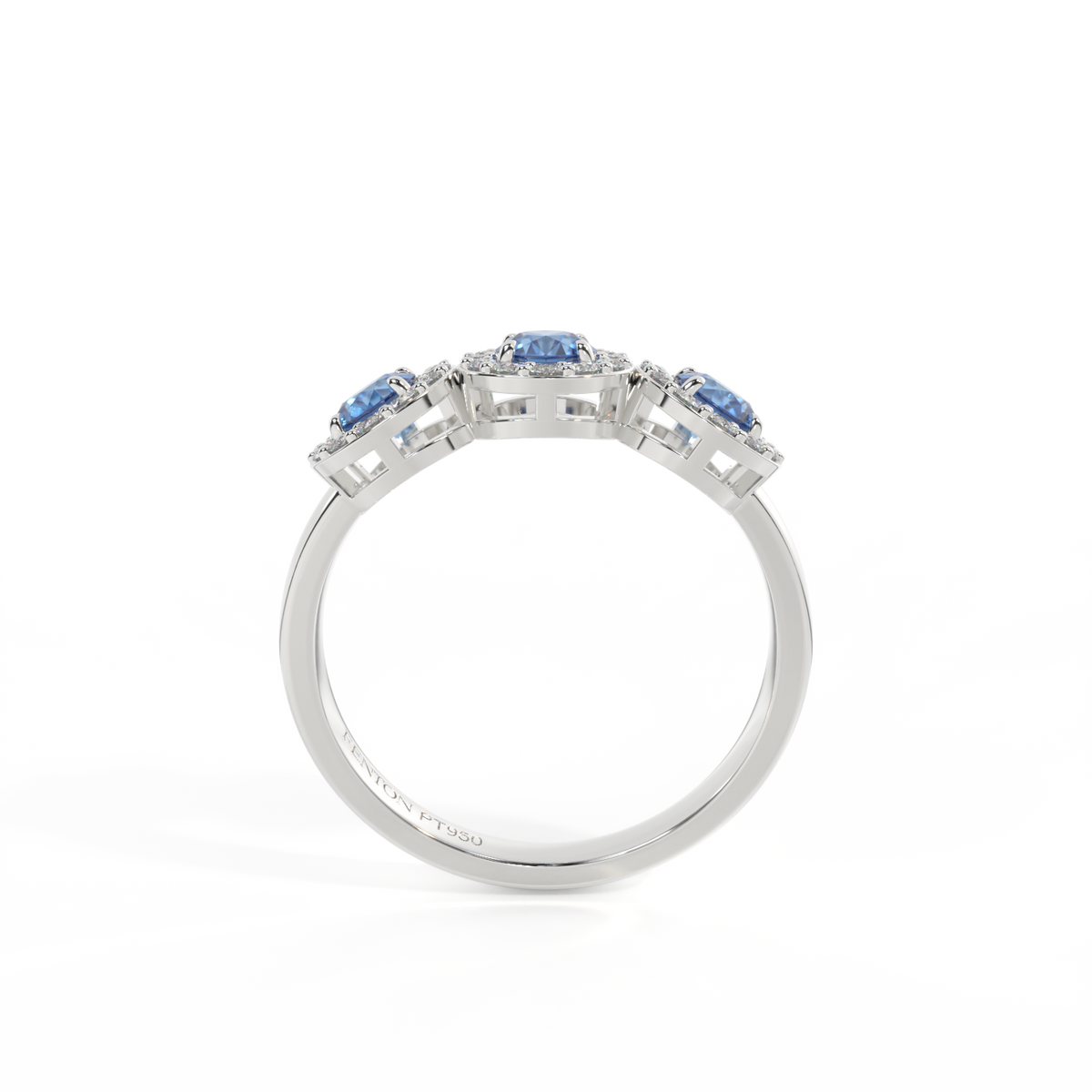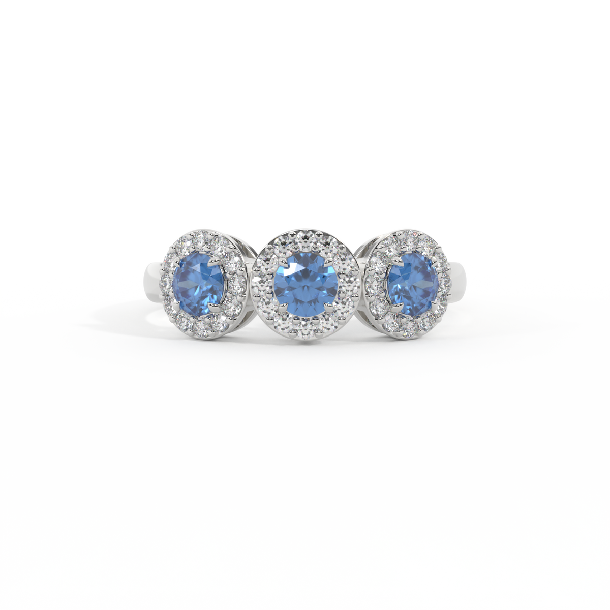 This low set, super wearable beauty, is reminiscent of a floral garland, one of the most universal symbols of love. Three Round cut Blue Sapphire stones are surrounded by diamond halos, each stone is completely unique.