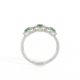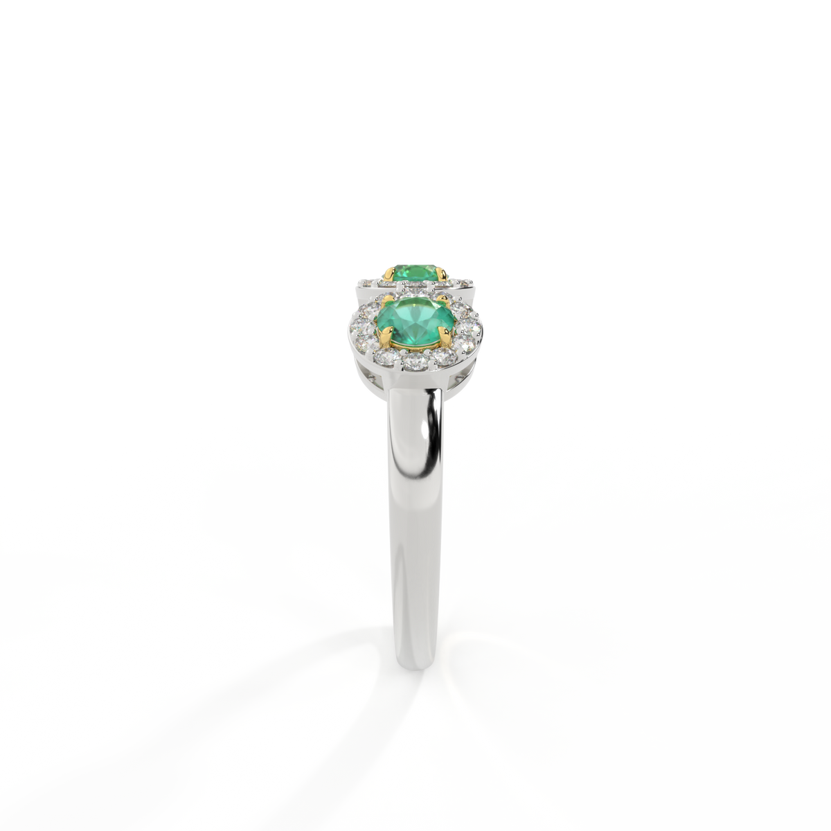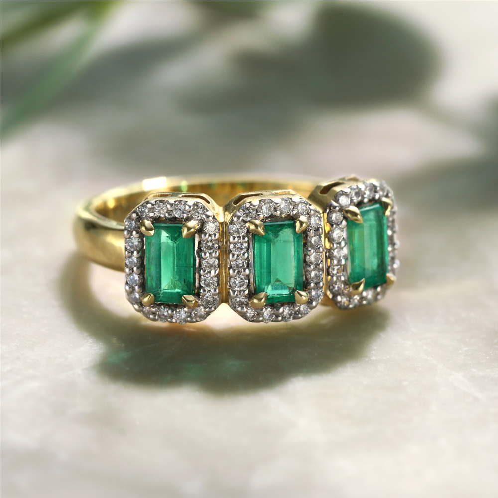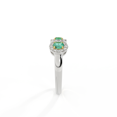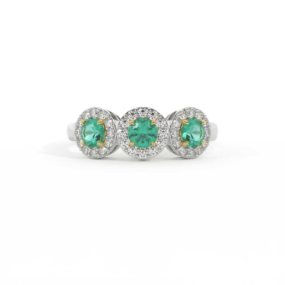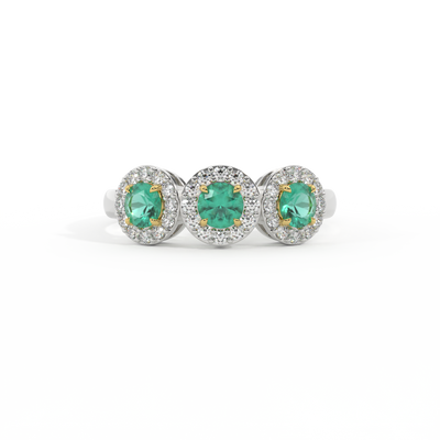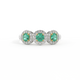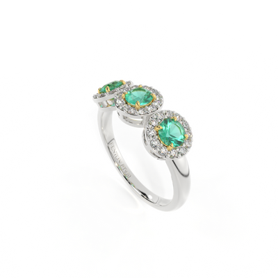 This low set, super wearable beauty, is reminiscent of a floral garland, one of the most universal symbols of love. Three Round cut Emerald stones are surrounded by diamond halos, each stone is completely unique.