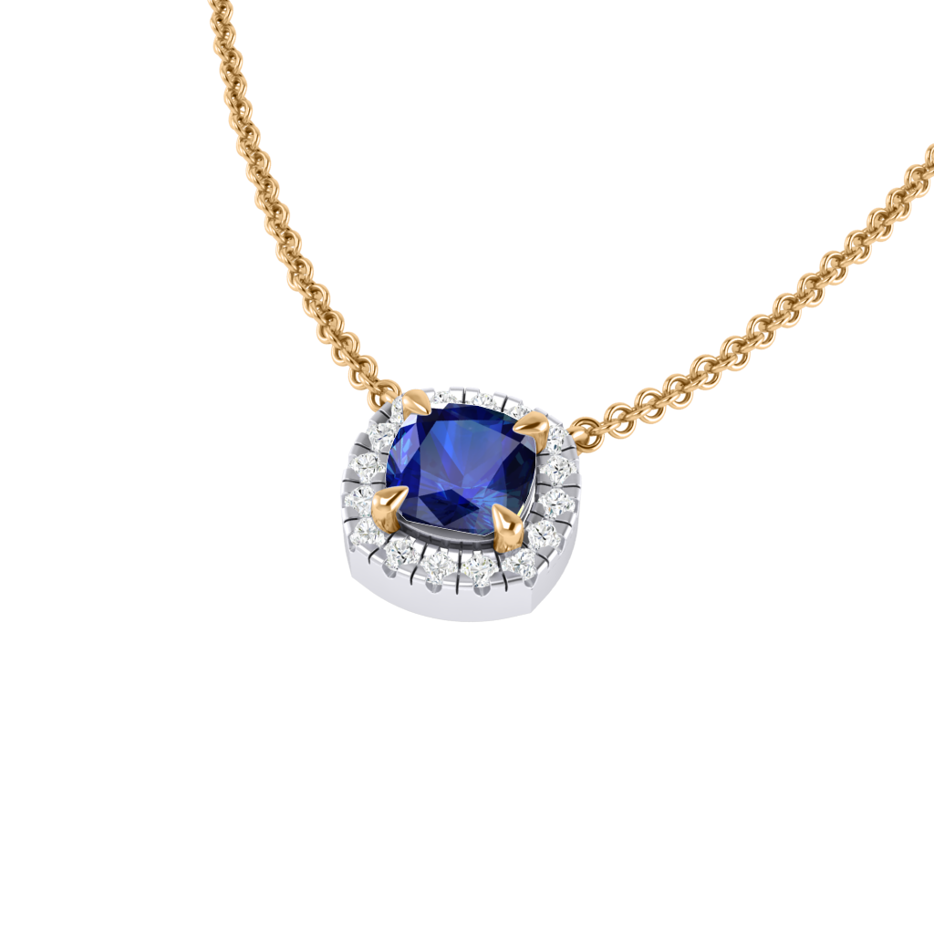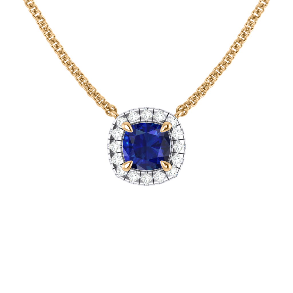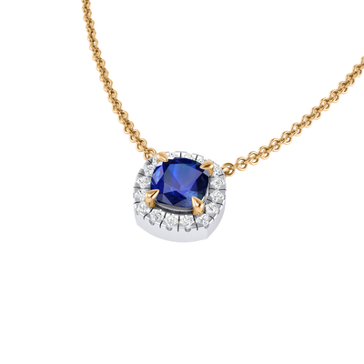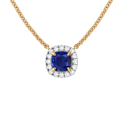The Halo Necklace is the perfect gift for just about any occasion. A solid 18K Yellow Gold chain securely holds a sparkling Cushion cut Blue Sapphire at the centre of your necklace surrounded by a halo of round brilliant-cut pavé G/H colour and VS clarity diamonds. The Halo Necklace is the perfect combination of finest craftsmanship and understated elegance.