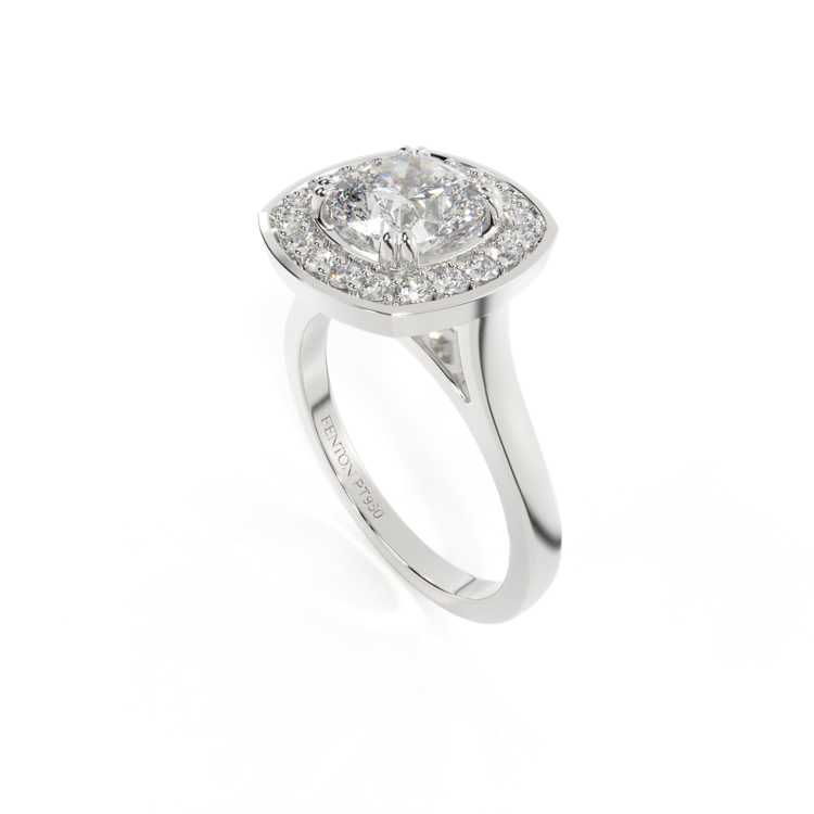 Your sparkling Lab Grown Diamond has a GH V/S quality rating and is framed by a halo of Diamond accent stones and set in bezel style. Your Platinum Lab Grown Diamond centre stone sits proudly on wed-fit shoulders to allow your wedding band to sit flush.