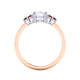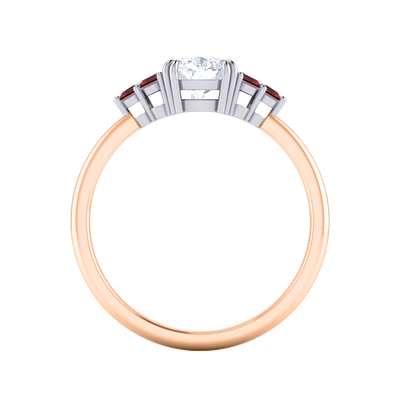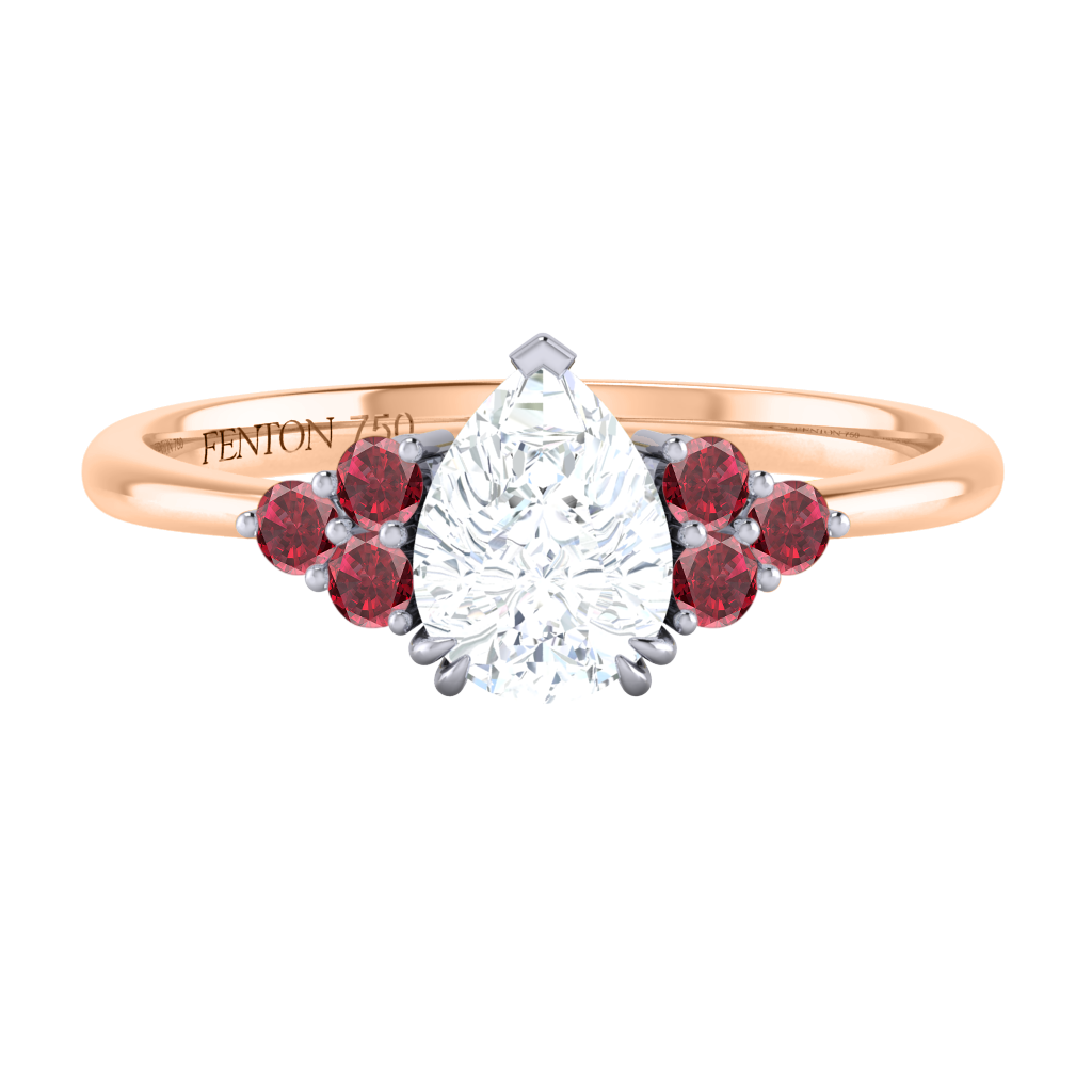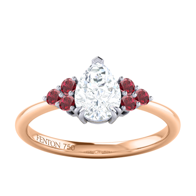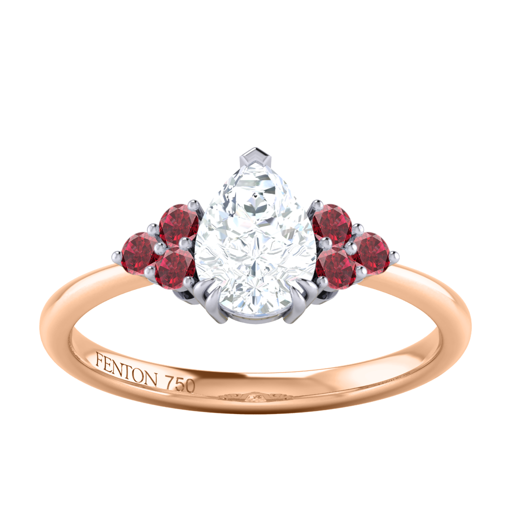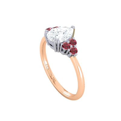 Your glistening undefined Naturally Mined Diamond has a GH V/S quality rating and is framed on either side by a trefoil cluster of three 1.8mm round brilliant cut Ruby stones, each securely held into place in a claw setting. The design draws the eye to the glistening Naturally Mined Diamond centre stone, sitting proudly in a classic open gallery setting crafted from solid 18K Rose Gold. The open setting of this design allows the light to reflect in all directions, creating a lustrous and sparkling look.