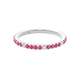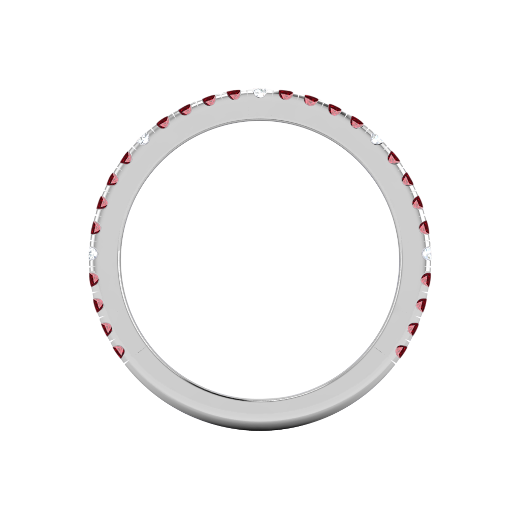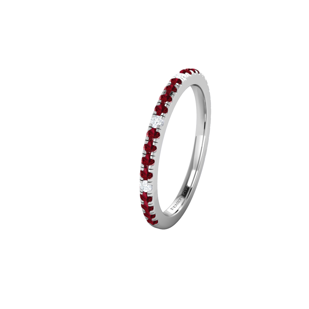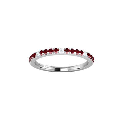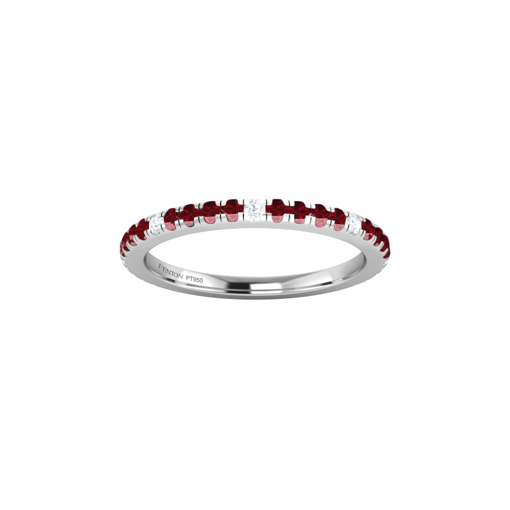 Putting a Fenton twist on a classic, meet the Eternity band in full colour. It's a beautiful ring worn solo or as a classic wedding band, stacked with your engagement ring. The Eternity band glistens with a string of round brilliant-cut Ruby stones and five G/H colour and VS clarity diamond accents for excellent brilliance. For extra comfort and durability, your stones cover 3/4 of your solid Platinum band.
