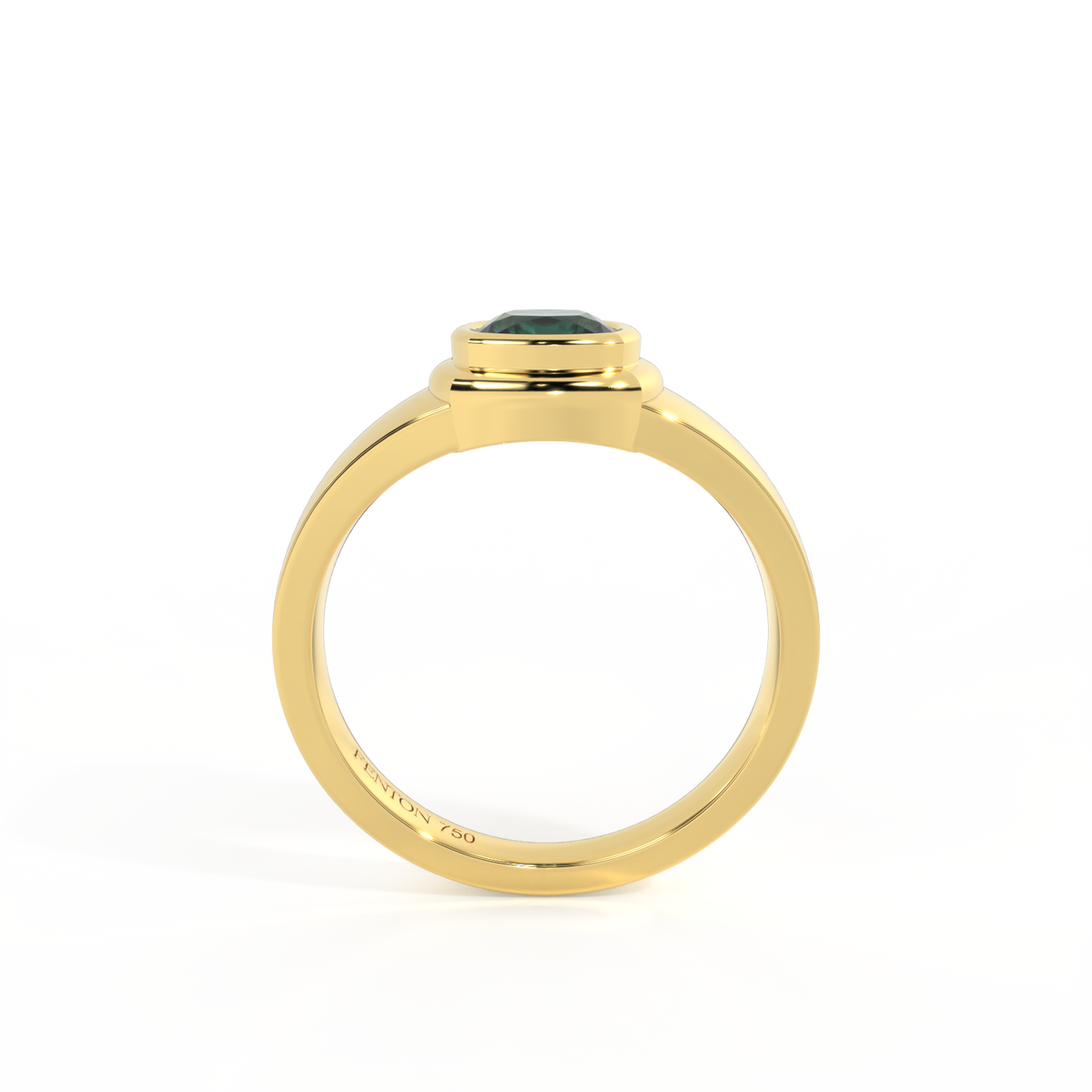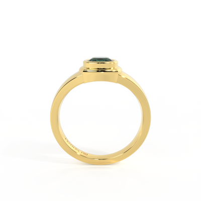 This iconic piece is set with a Cushion cut Teal Sapphire, which sits slightly proud above the 18K Yellow Gold band in a stepped bezel setting. The shoulders taper outwards towards the centre, with a rounded shank for maximum comfort. A modern heirloom for the everyday.