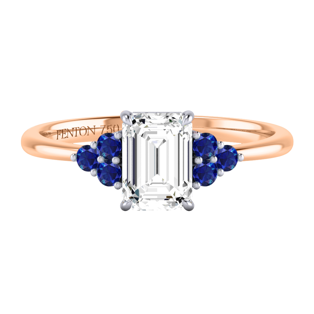 Your glistening Emerald Solar Diamond has a EF V/S quality rating and is framed on either side by a trefoil cluster of three 1.8mm round brilliant cut Blue Sapphire stones, each securely held into place in a claw setting. The design draws the eye to the glistening Solar Diamond centre stone, sitting proudly in a classic open gallery setting crafted from solid 18K Rose Gold. The open setting of this design allows the light to reflect in all directions, creating a lustrous and sparkling look.