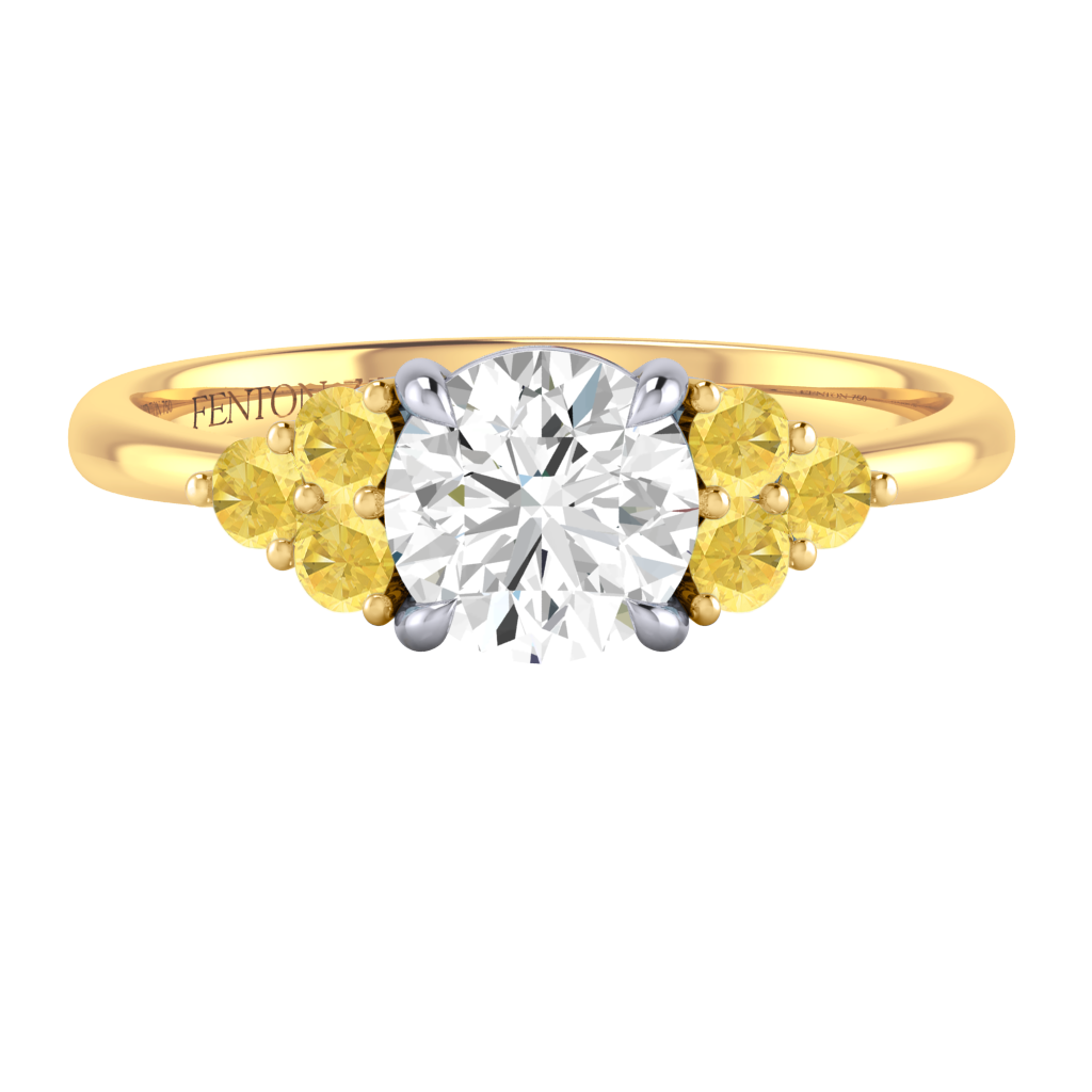 Your glistening Round Solar Diamond has a EF V/S quality rating and is framed on either side by a trefoil cluster of three 1.8mm round brilliant cut Yellow Sapphire stones, each securely held into place in a claw setting. The design draws the eye to the glistening Solar Diamond centre stone, sitting proudly in a classic open gallery setting crafted from solid Platinum. The open setting of this design allows the light to reflect in all directions, creating a lustrous and sparkling look.
