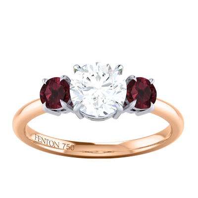 Proof that three isn't always a crowd, our Solar Diamond Trilogy Ring unites a sparkling Solar Diamond centre stone with two surrounding Garnet each set in a secure four single- or double claw setting and complimenting the exquisite sparkle of your Solar Diamond stone. Your Round Solar Diamond stone has a EF V/S quality rating and is set in a simple yet elegant gallery feeding smoothly into a sleek and simple 18K Rose Gold band ranging from 1.90 - 2.20mm.