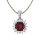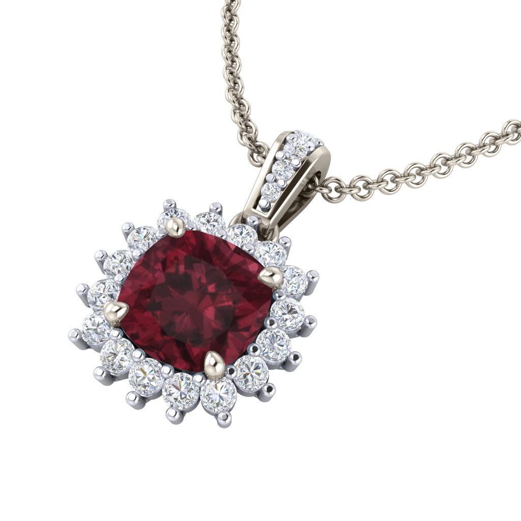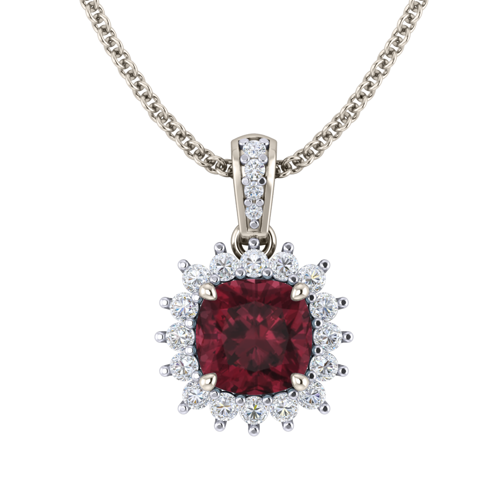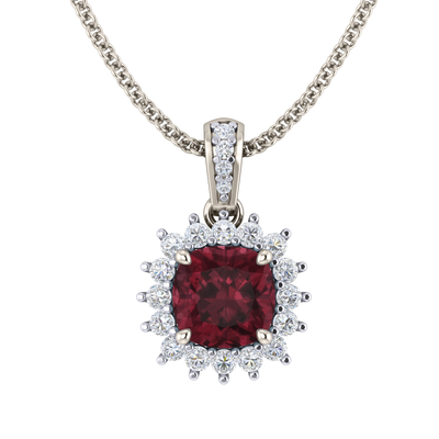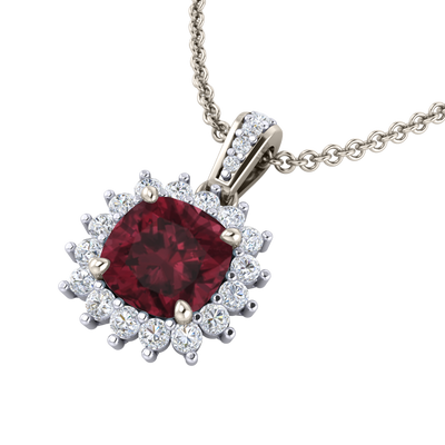 Sparkle from night to day with your Garnet Star Pendant Necklace. This pendant necklace features a single G/H colour and VS clarity diamond halo and sparkling diamond-encrusted bale holding your Cushion cut Garnet stone.