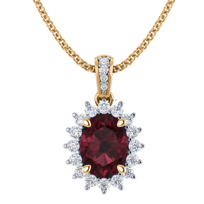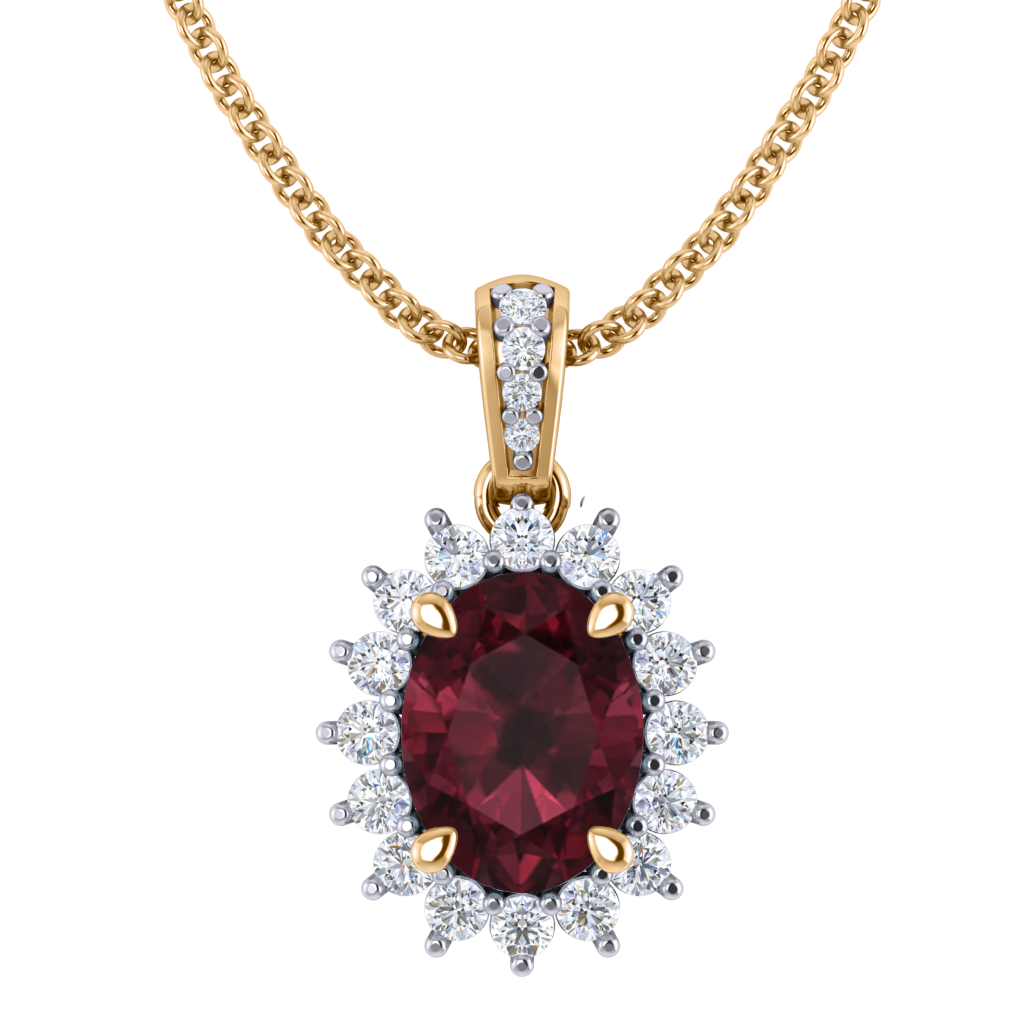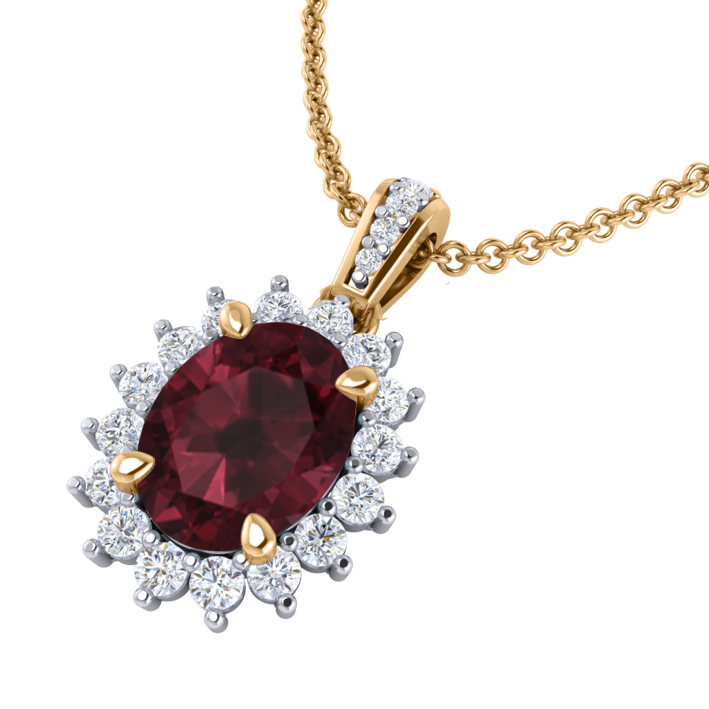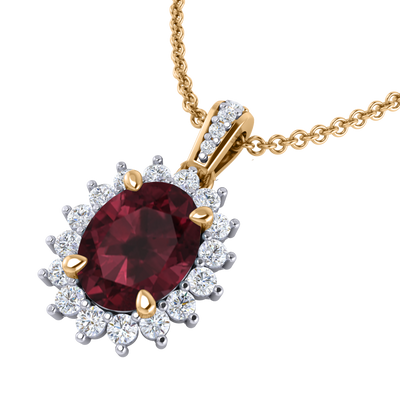 Sparkle from night to day with your Garnet Star Pendant Necklace. This pendant necklace features a single G/H colour and VS clarity diamond halo and sparkling diamond-encrusted bale holding your Oval cut Garnet stone.