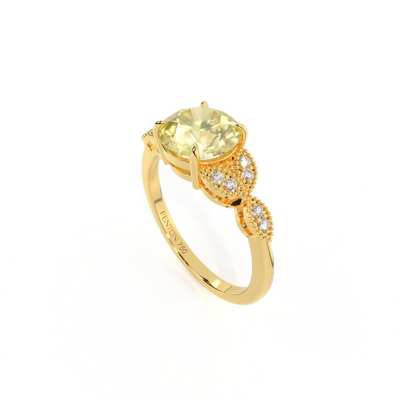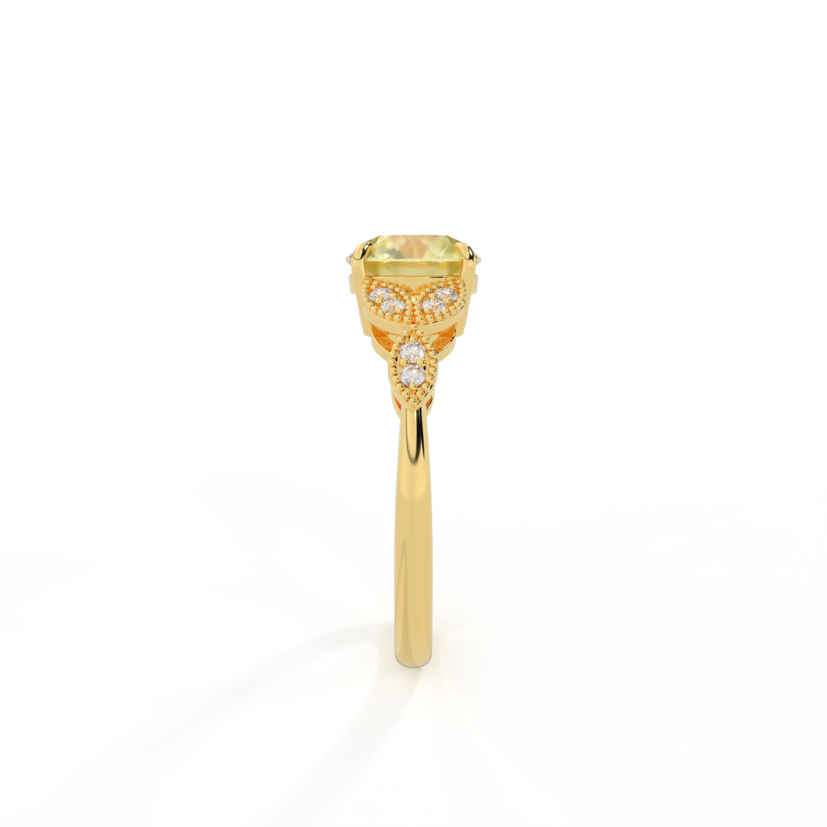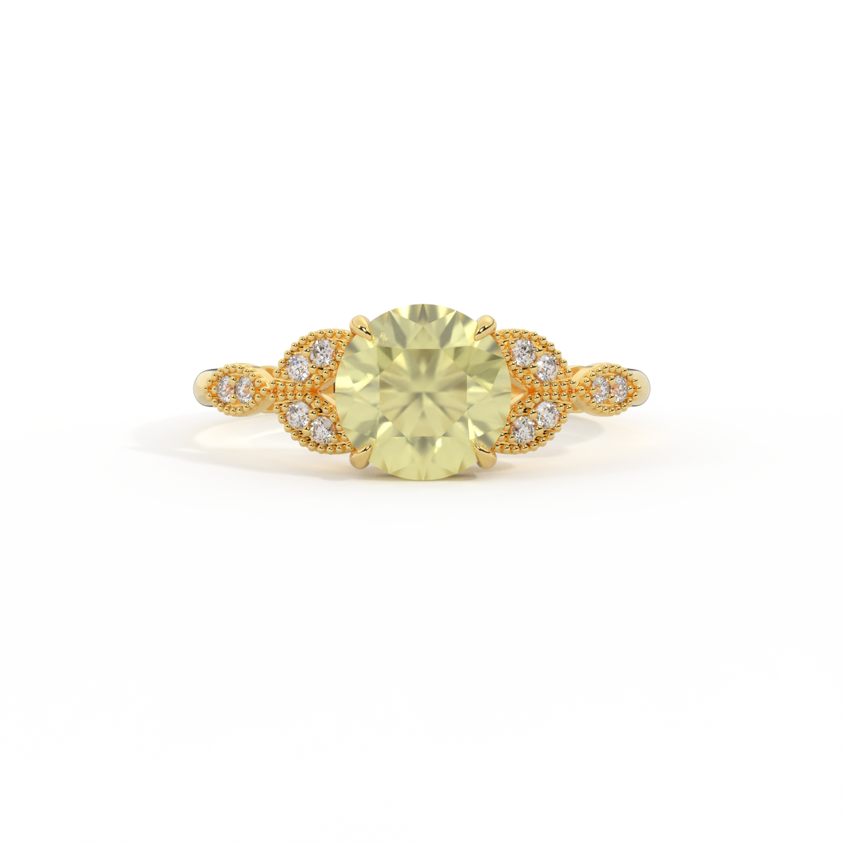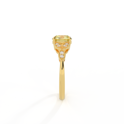 The beauty of a flower, re-imagined for eternity. Inspired by the romance of the Victorian era, this round cut Yellow Sapphire is accentuated by a duo of delicate diamond-set petals with millegrain detail for an elegant twist on a timeless classic.