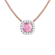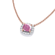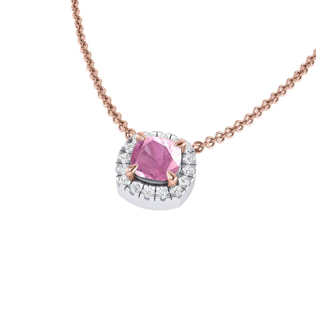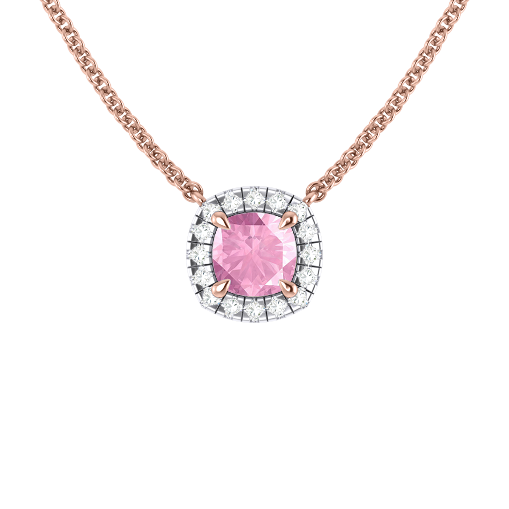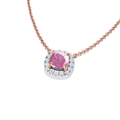 The Halo Necklace is the perfect gift for just about any occasion. A solid 18K Yellow Gold chain securely holds a sparkling Cushion Pink Sapphire stone at the centre of your necklace surrounded by a halo of round brilliant-cut pavé G/H colour and VS clarity diamonds. The Halo Necklace is the perfect combination of finest craftsmanship and understated elegance.