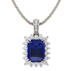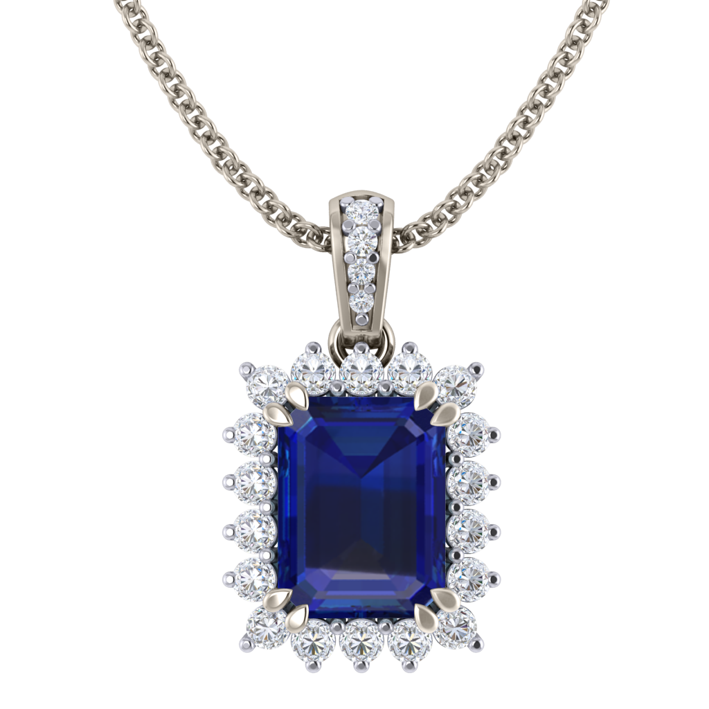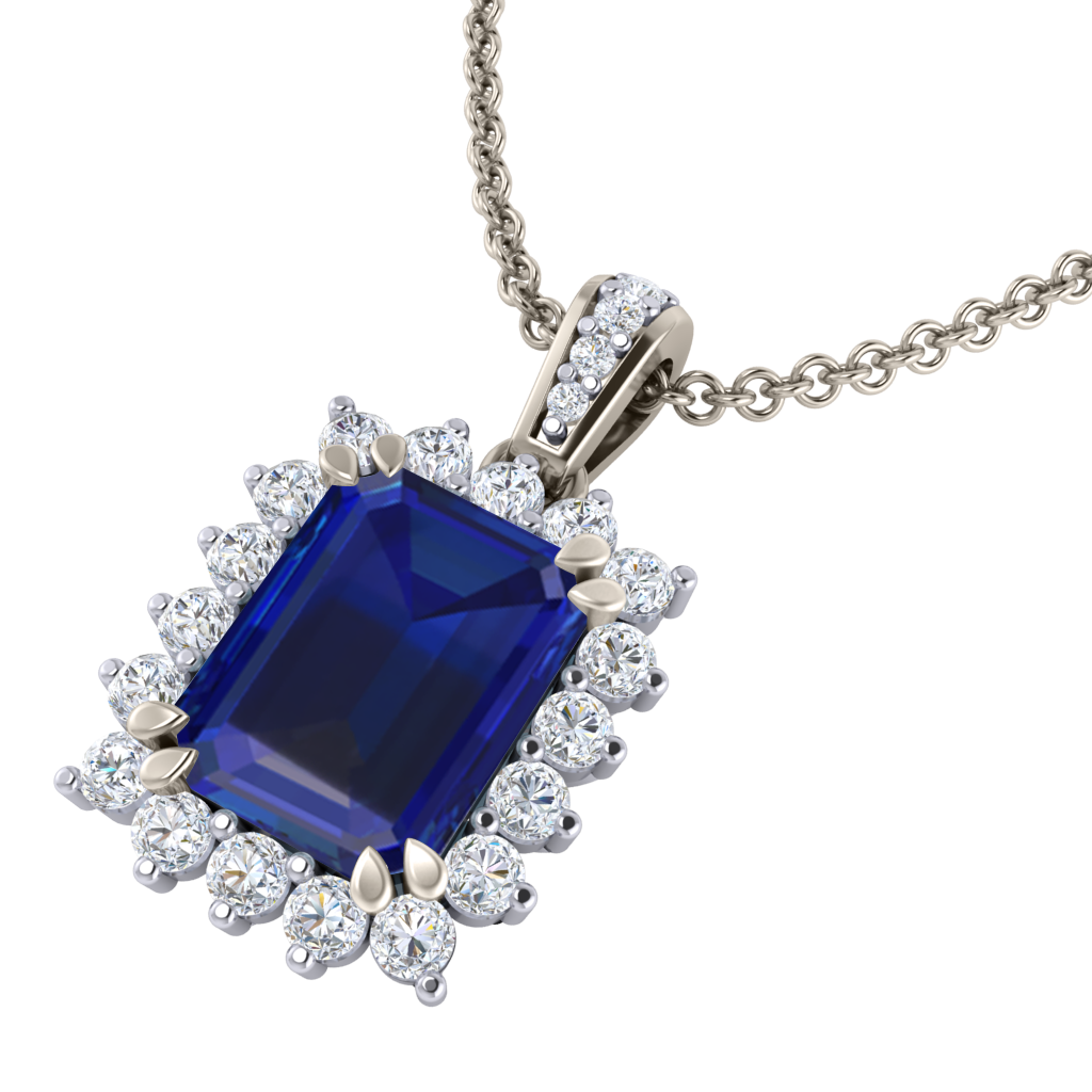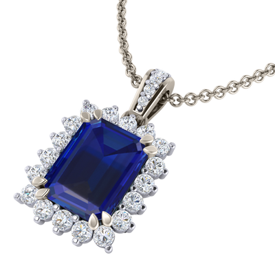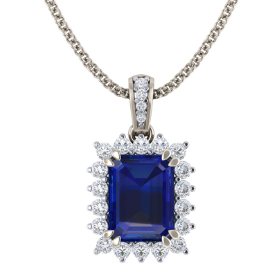 Sparkle from night to day with your Blue Sapphire Star Pendant Necklace. This pendant necklace features a single G/H colour and VS clarity diamond halo and sparkling diamond-encrusted bale holding your Emerald Blue Sapphire stone.