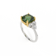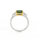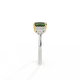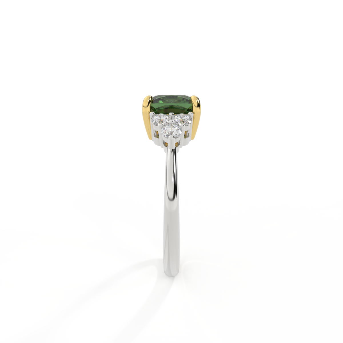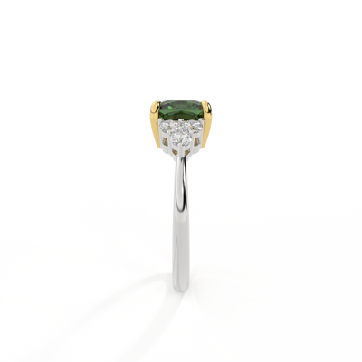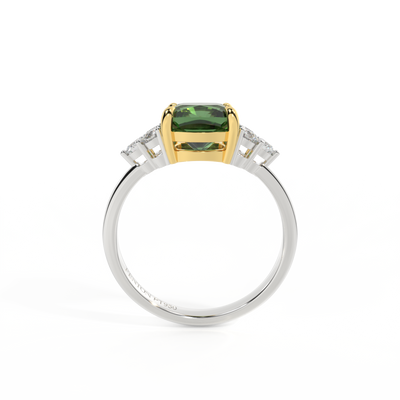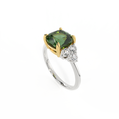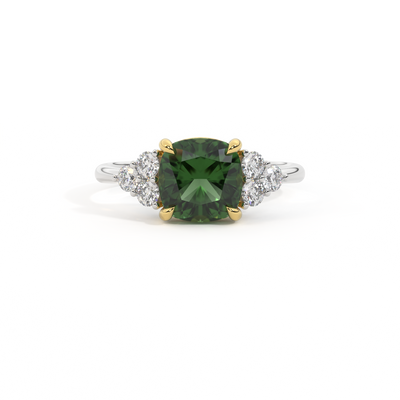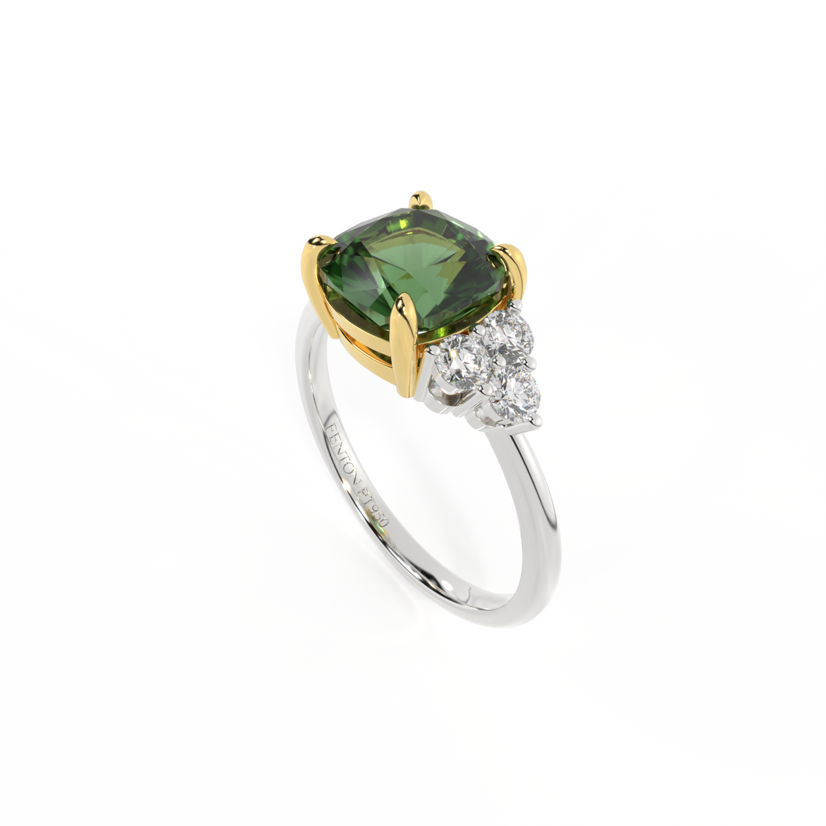 Your glistening Cushion cut Green Sapphire is framed on either side by a trefoil cluster of three 1.8mm round brilliant cut GH/VS diamonds, each securely held into place in a claw setting. The design draws the eye to the glistening Ruby centre stone, sitting proudly in a classic open gallery setting crafted from solid, recycled 18K gold or platinum. The open setting of this design allows the light to reflect in all directions, creating a lustrous and sparkling look.