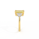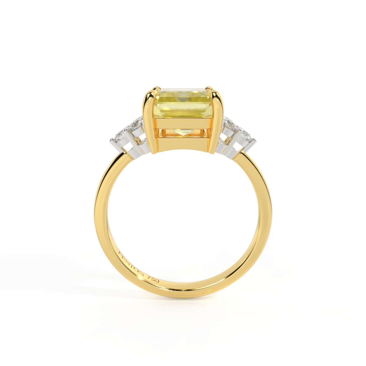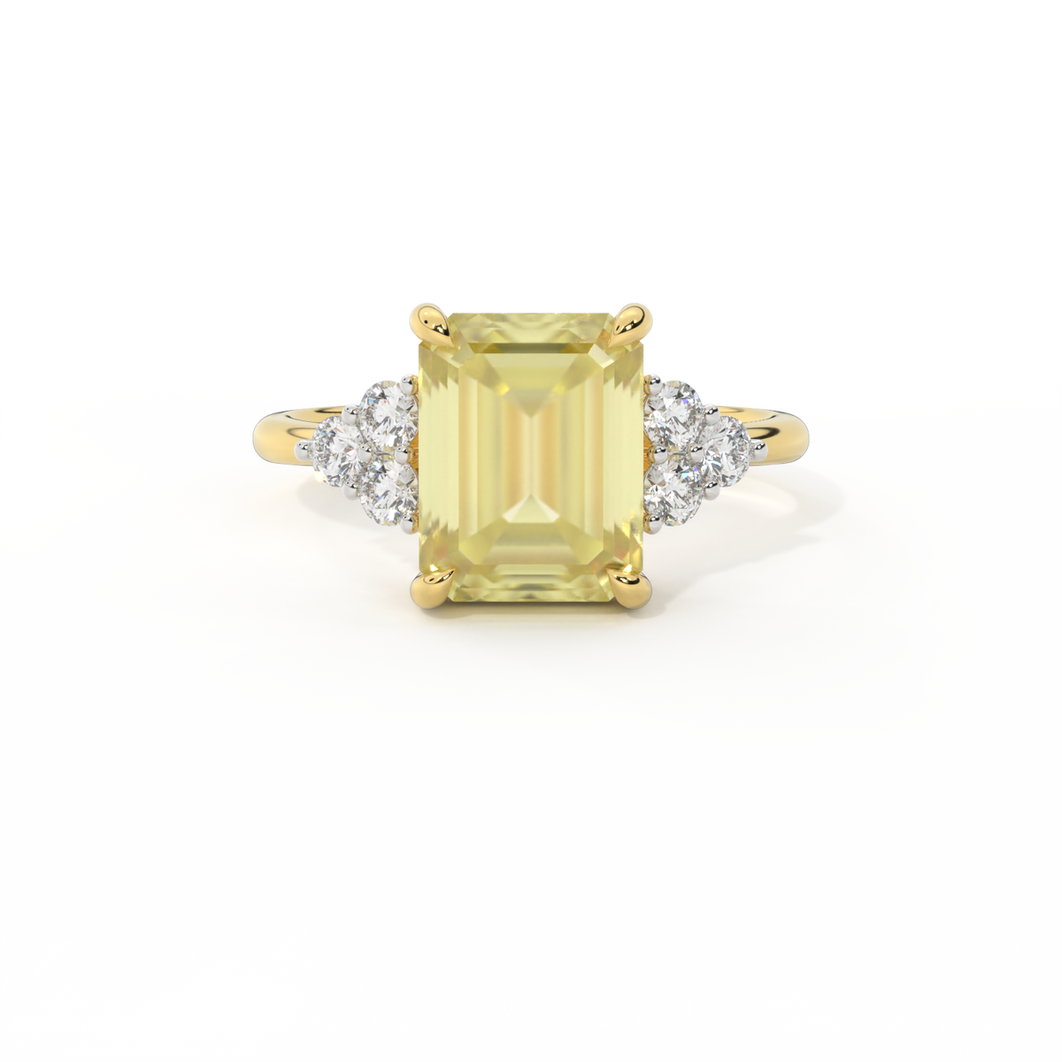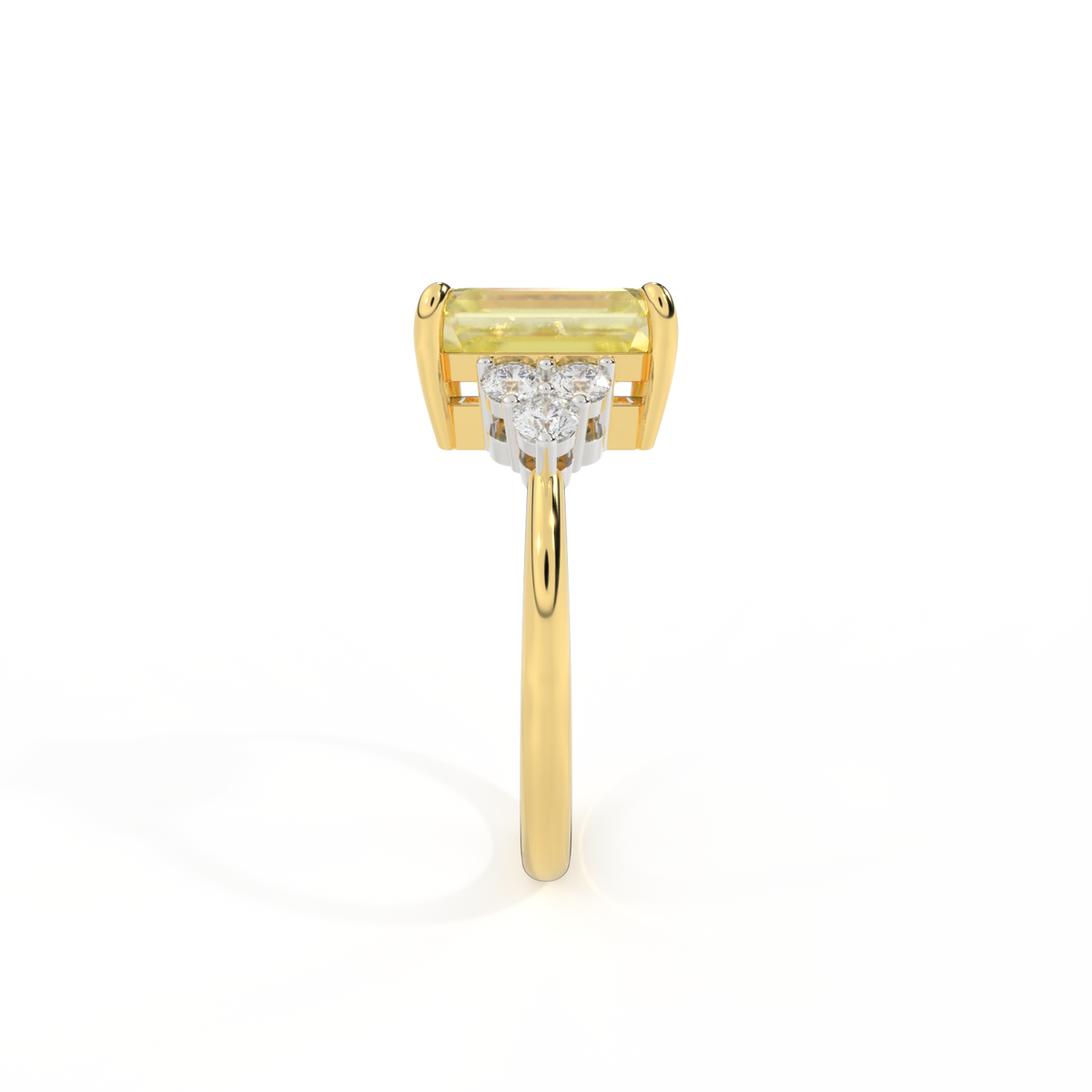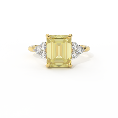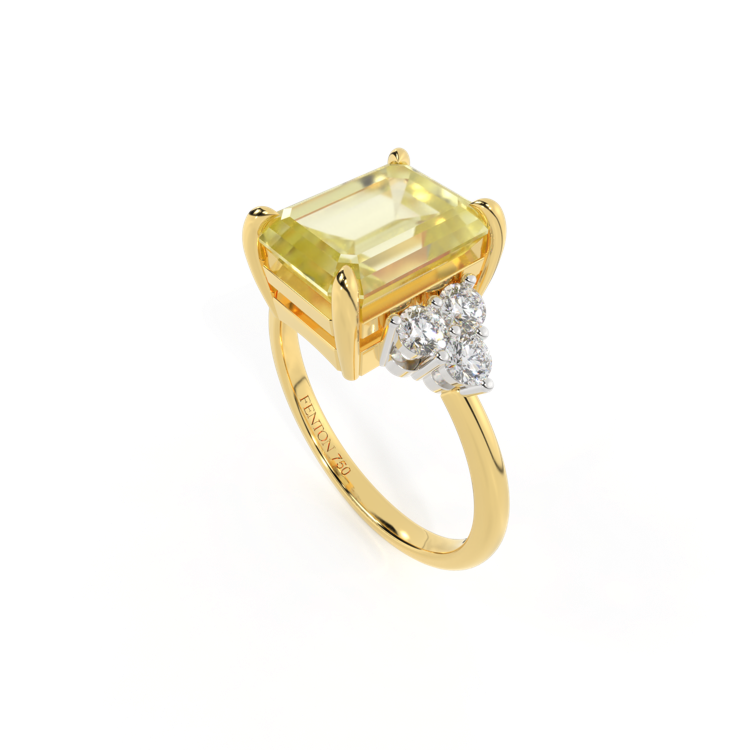 Your glistening Emerald cut Yellow Sapphire is framed on either side by a trefoil cluster of three 1.8mm round brilliant cut GH/VS diamonds, each securely held into place in a claw setting. The design draws the eye to the glistening Yellow Sapphire centre stone, sitting proudly in a classic open gallery setting crafted from solid, recycled 18K gold or platinum. The open setting of this design allows the light to reflect in all directions, creating a lustrous and sparkling look.
