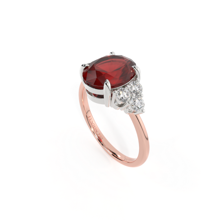 Your glistening Oval cut Garnet is framed on either side by a trefoil cluster of three 1.8mm round brilliant cut GH/VS diamonds, each securely held into place in a claw setting. The design draws the eye to the glistening Garnet centre stone, sitting proudly in a classic open gallery setting crafted from solid, recycled 18K gold or platinum. The open setting of this design allows the light to reflect in all directions, creating a lustrous and sparkling look.