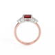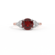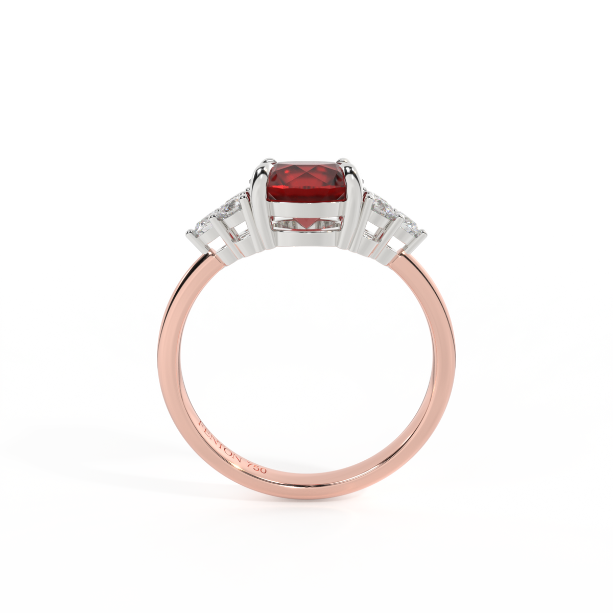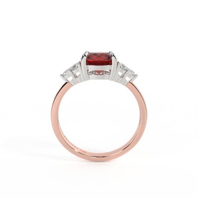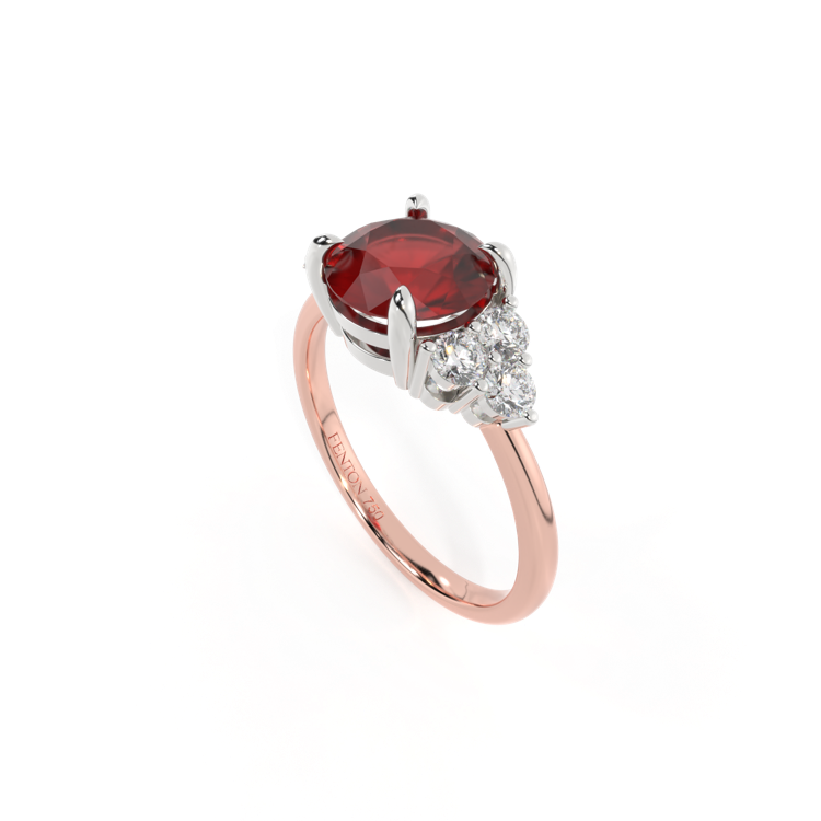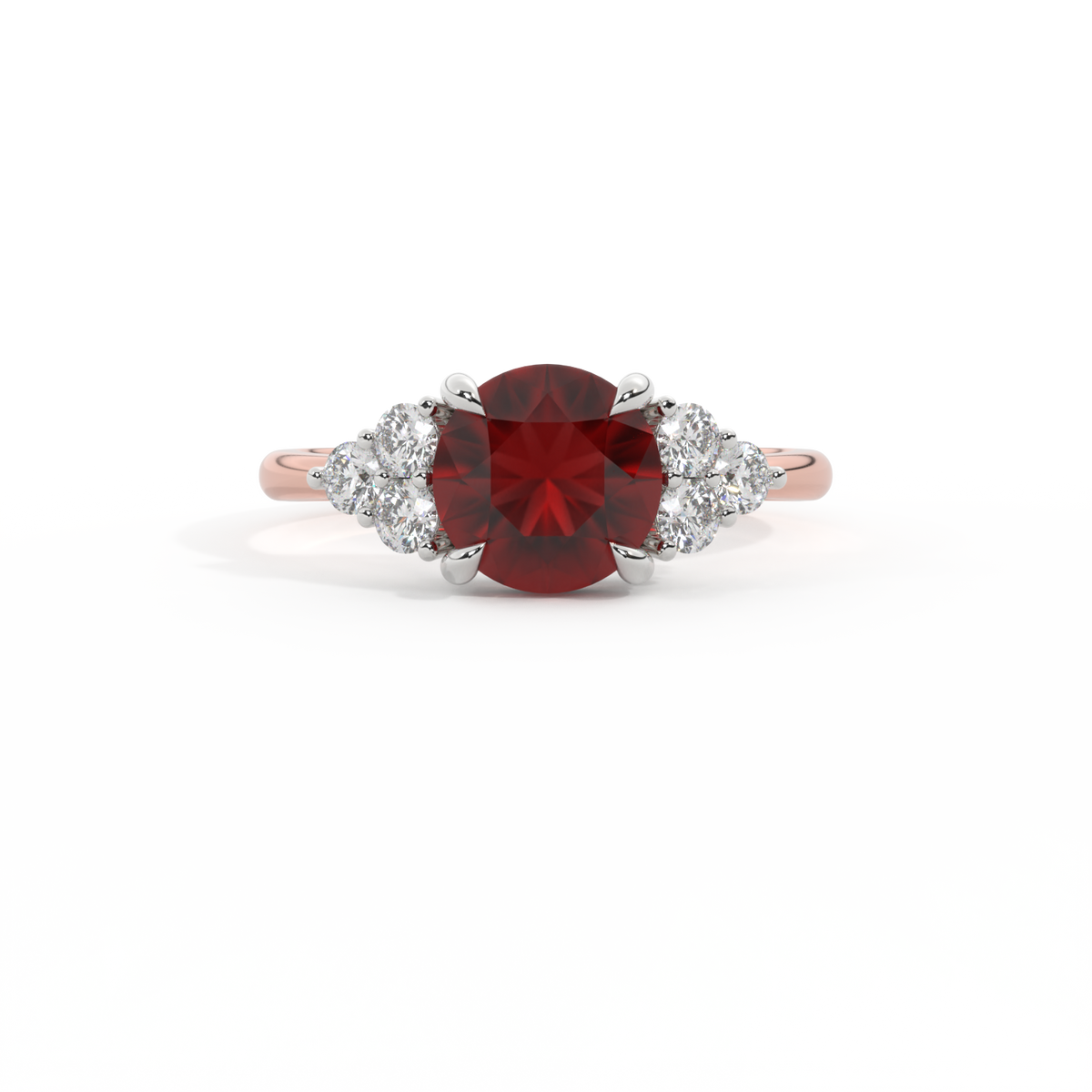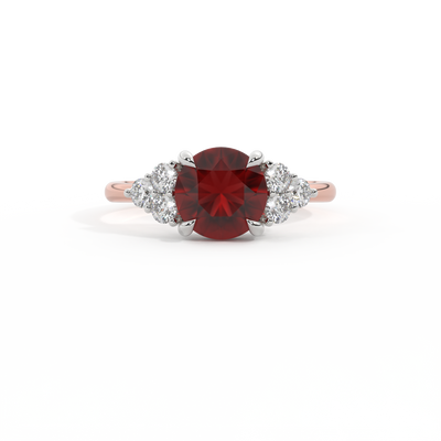 Your glistening Round cut Garnet is framed on either side by a trefoil cluster of three 1.8mm round brilliant cut GH/VS diamonds, each securely held into place in a claw setting. The design draws the eye to the glistening Garnet centre stone, sitting proudly in a classic open gallery setting crafted from solid, recycled 18K gold or platinum. The open setting of this design allows the light to reflect in all directions, creating a lustrous and sparkling look.