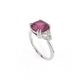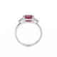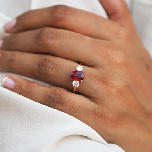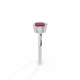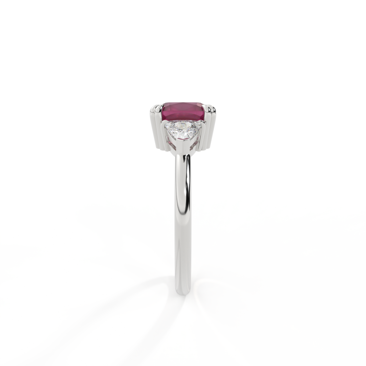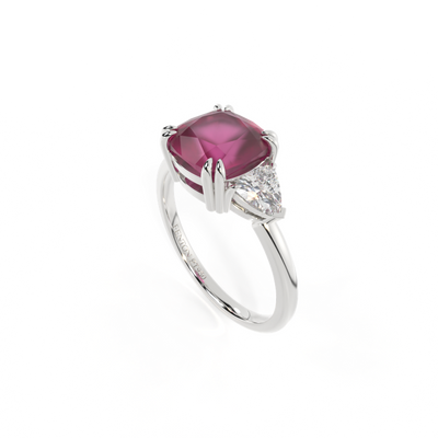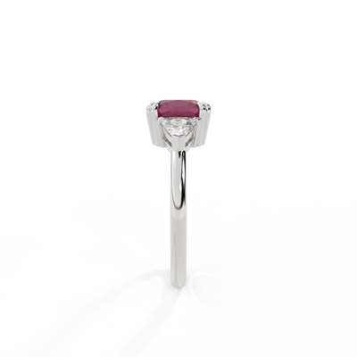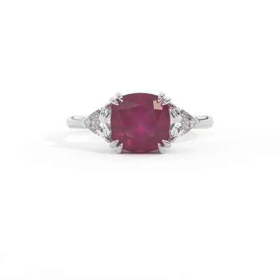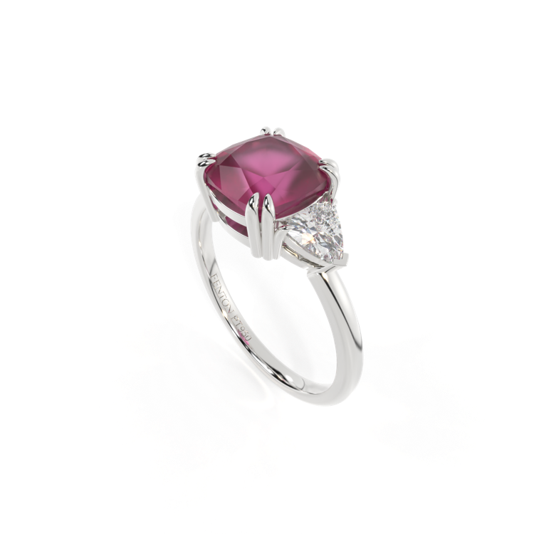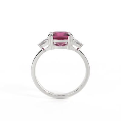 All of our rings are available in blue sapphire, ruby, emerald, pink sapphire, yellow sapphire, garnet and aquamarine. We offer three metals, 18K rose gold, 18K yellow gold and platinum. The centre stones are available in four cuts, round, cushion, oval and emerald cut and five sizes for each cut and style.