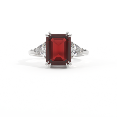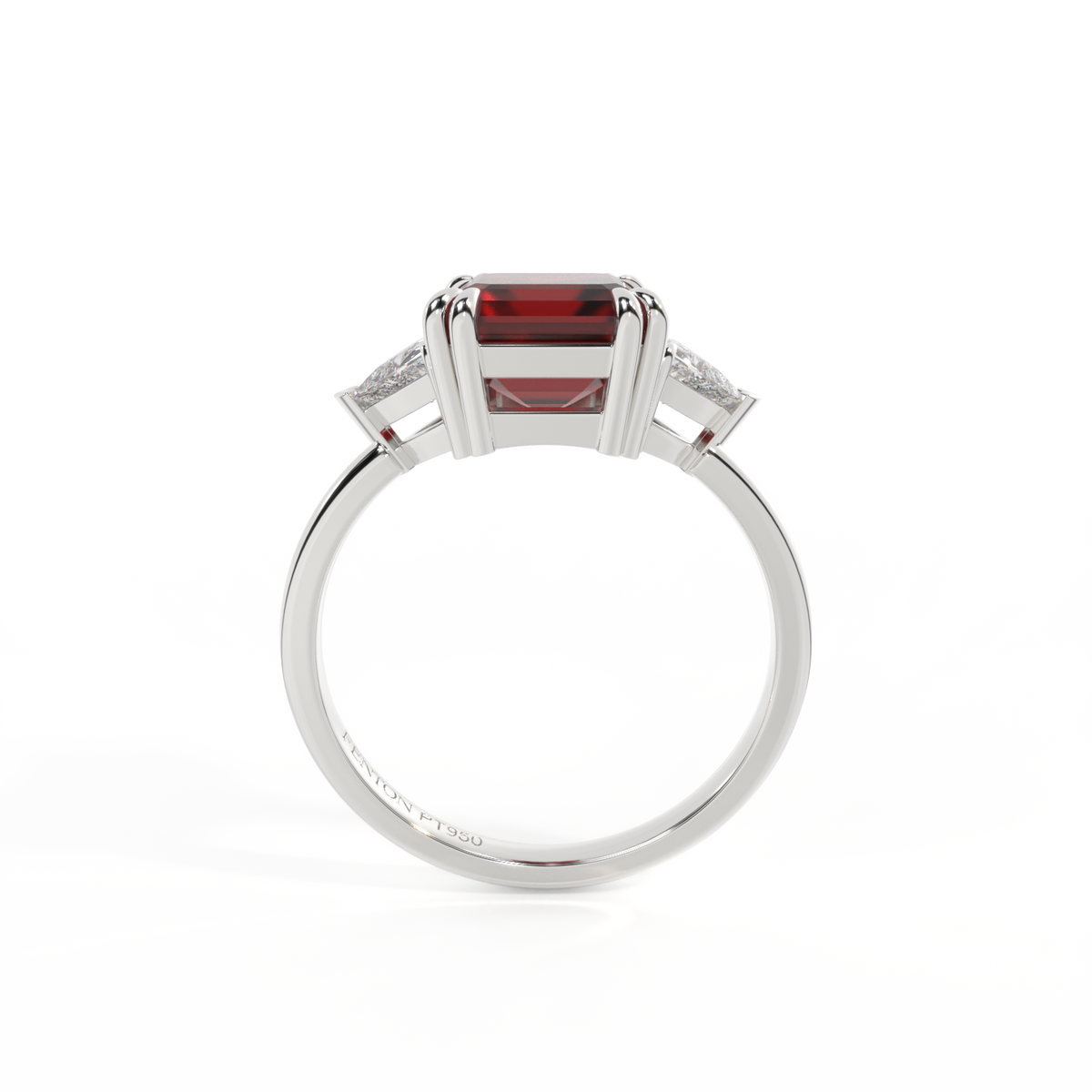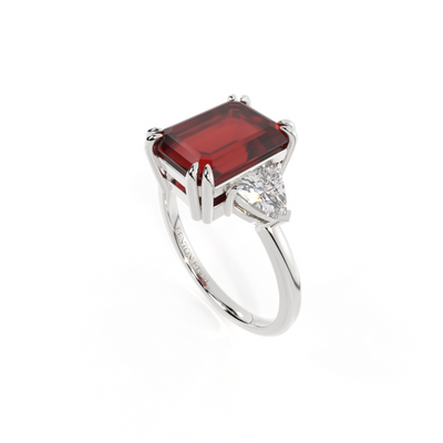 All of our rings are available in blue sapphire, ruby, emerald, pink sapphire, yellow sapphire, garnet and aquamarine. We offer three metals, 18K rose gold, 18K yellow gold and platinum. The centre stones are available in four cuts, round, cushion, oval and emerald cut and five sizes for each cut and style.