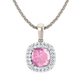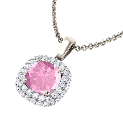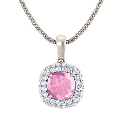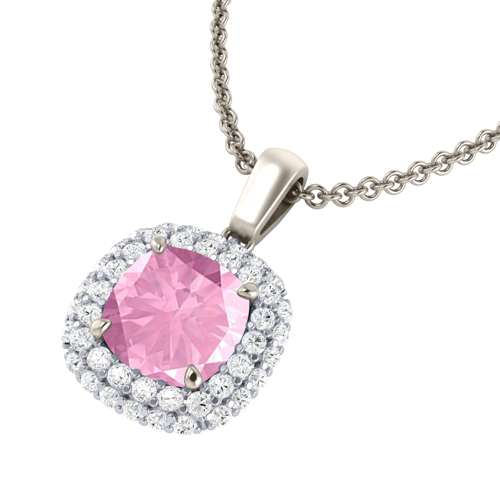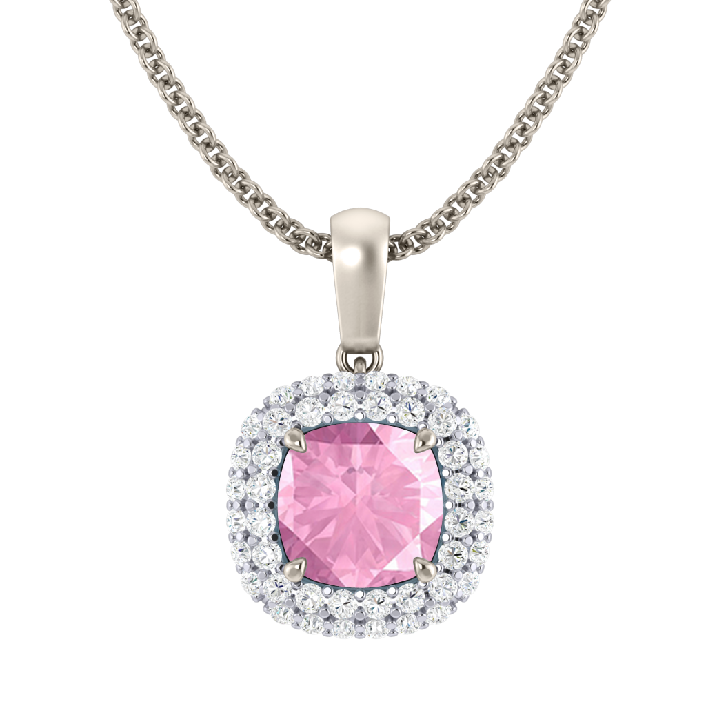 Wear your Pink Sapphire close to your heart with our Vintage Pendant Necklace. The sparkling Cushion cut Pink Sapphire pedant is framed with a double halo of G/H colour and VS clarity diamonds giving the necklace its much-loved vintage aesthetic inspired by 18th century jewellery pieces.