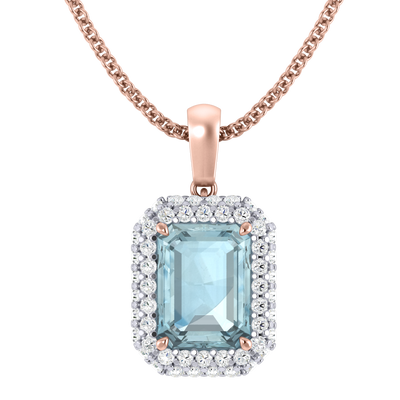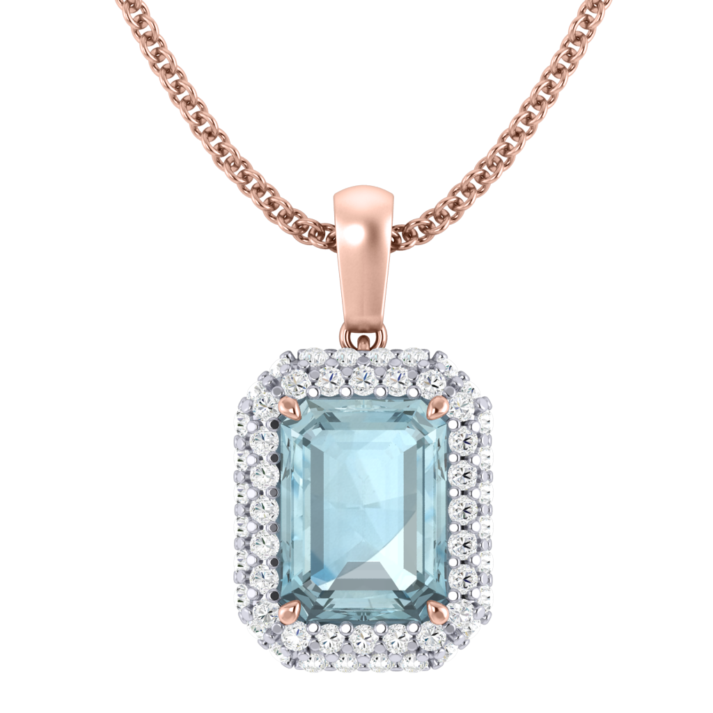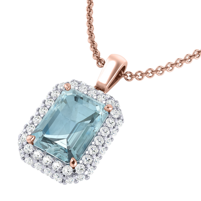 Wear your Aquamarine close to your heart with our Vintage Pendant Necklace. The sparkling Emerald cut Aquamarine pedant is framed with a double halo of G/H colour and VS clarity diamonds giving the necklace its much-loved vintage aesthetic inspired by 18th century jewellery pieces.