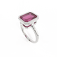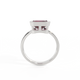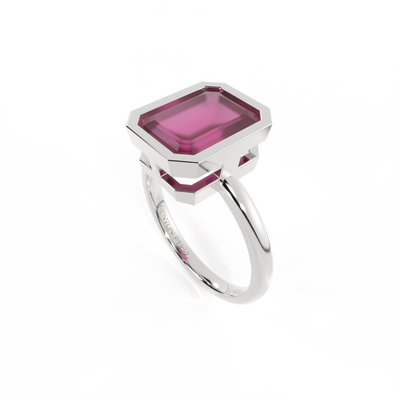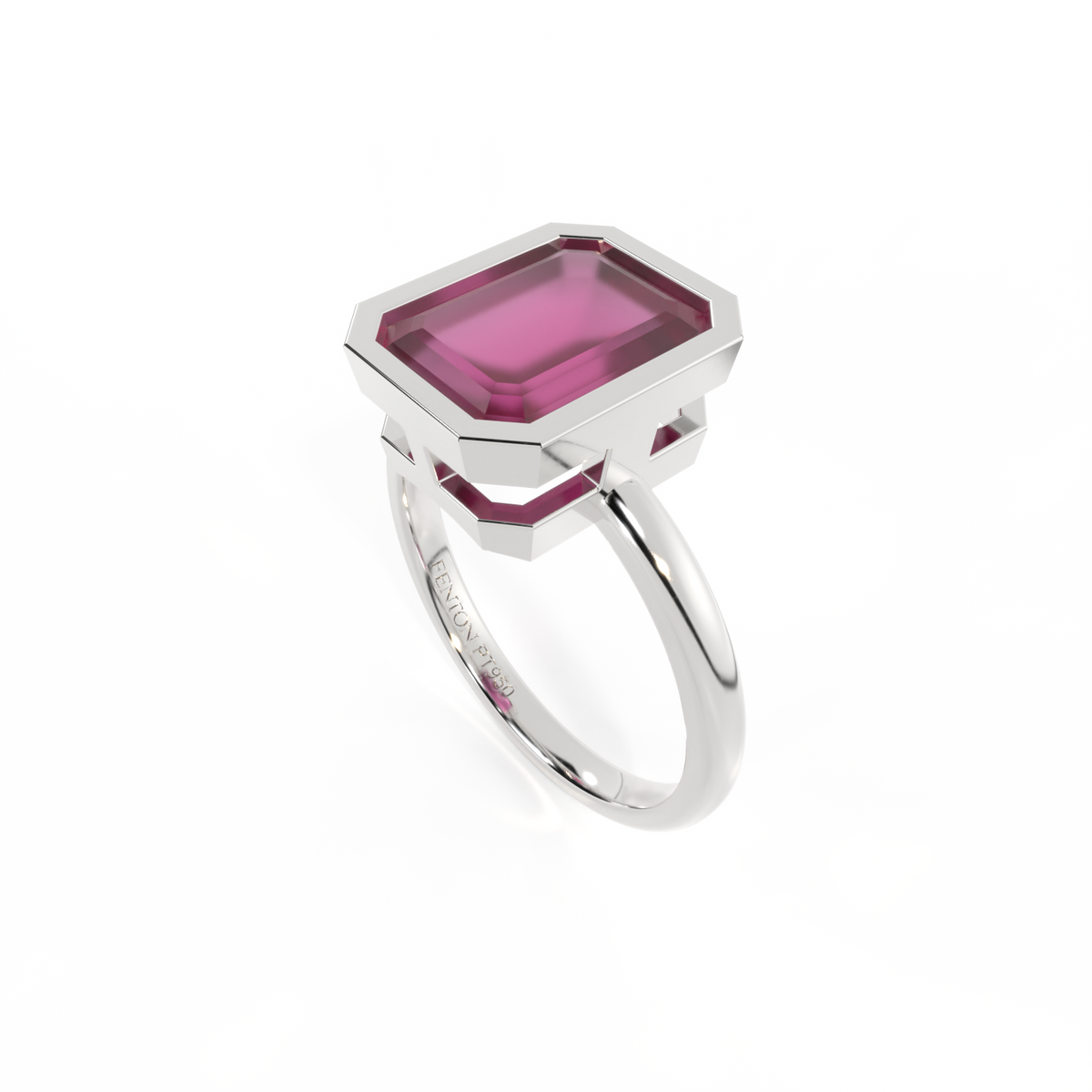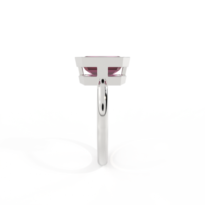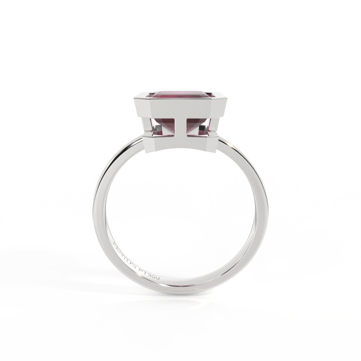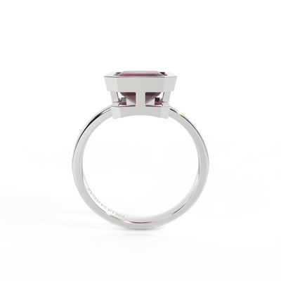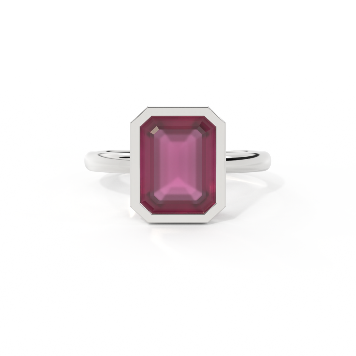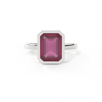 Minimalism meets modernism - the unique characteristics of this Emerald cut Ruby are given center stage in The Bezel. A modern take on a solitaire, this style frames the 6mm Ruby in a secure custom made setting that's simple and striking at the same time.