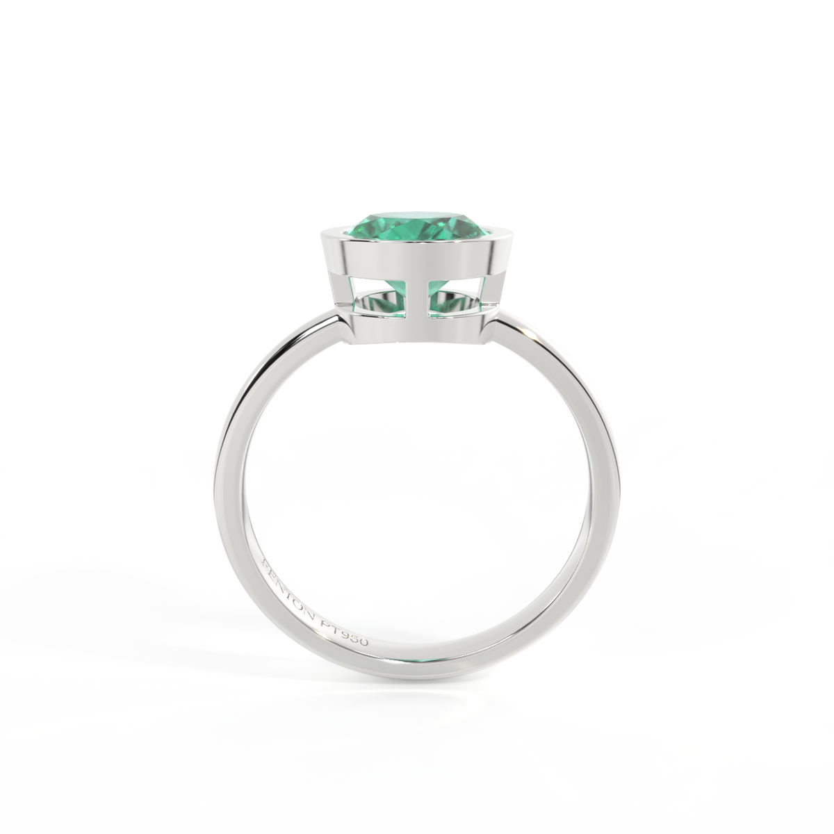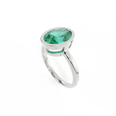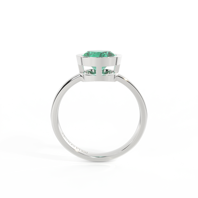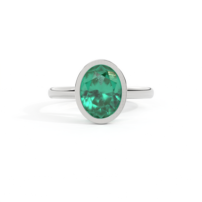 Minimalism meets modernism - the unique characteristics of this Oval cut Emerald are given center stage in The Bezel. A modern take on a solitaire, this style frames the 6mm Emerald in a secure custom made setting that's simple and striking at the same time.