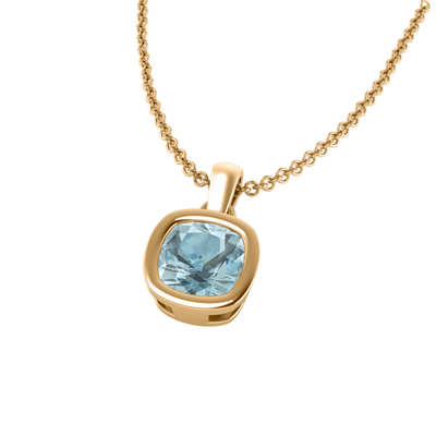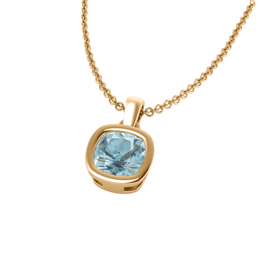 The Bezel Pendant Necklace combines minimalism with modern elegance. The Cushion cut Aquamarine pendant is bezel-set in a 18K Yellow Gold rim and effortlessly balances on a matching chain.
