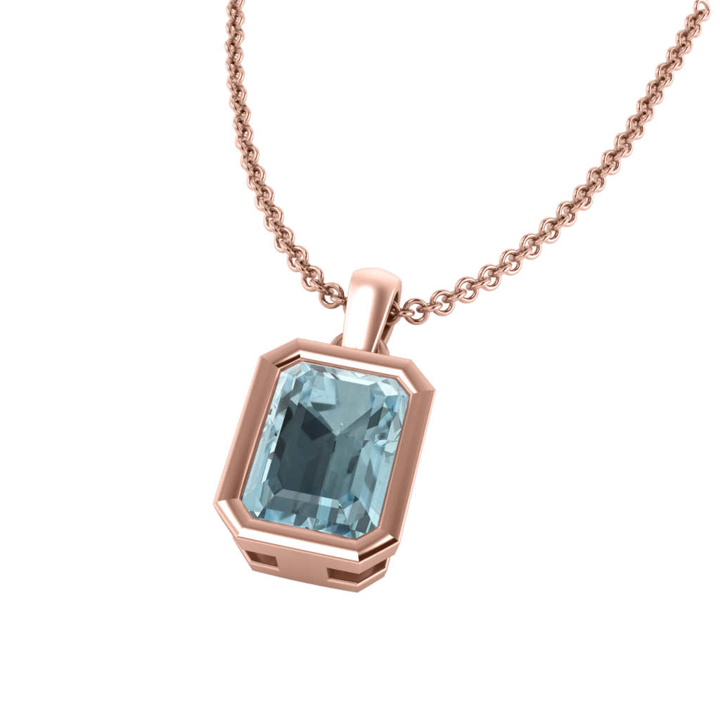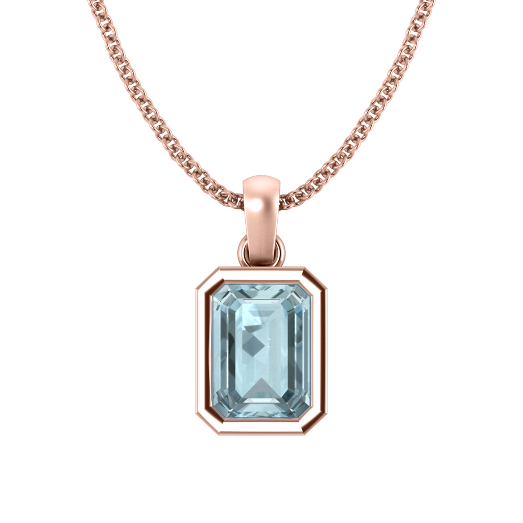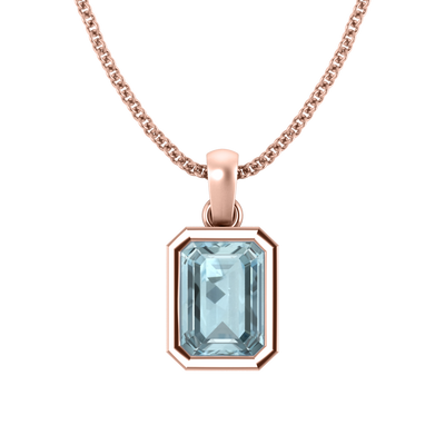 The Bezel Pendant Necklace combines minimalism with modern elegance. The Emerald cut Aquamarine pendant is bezel-set in a 18K Rose Gold rim and effortlessly balances on a matching chain.