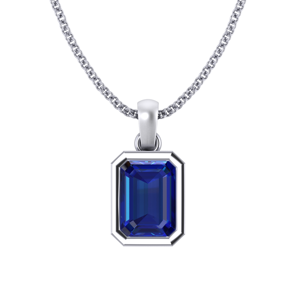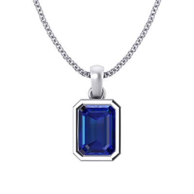 Bezel Emerald Cut Blue Sapphire 18K White Gold Pendant Necklace