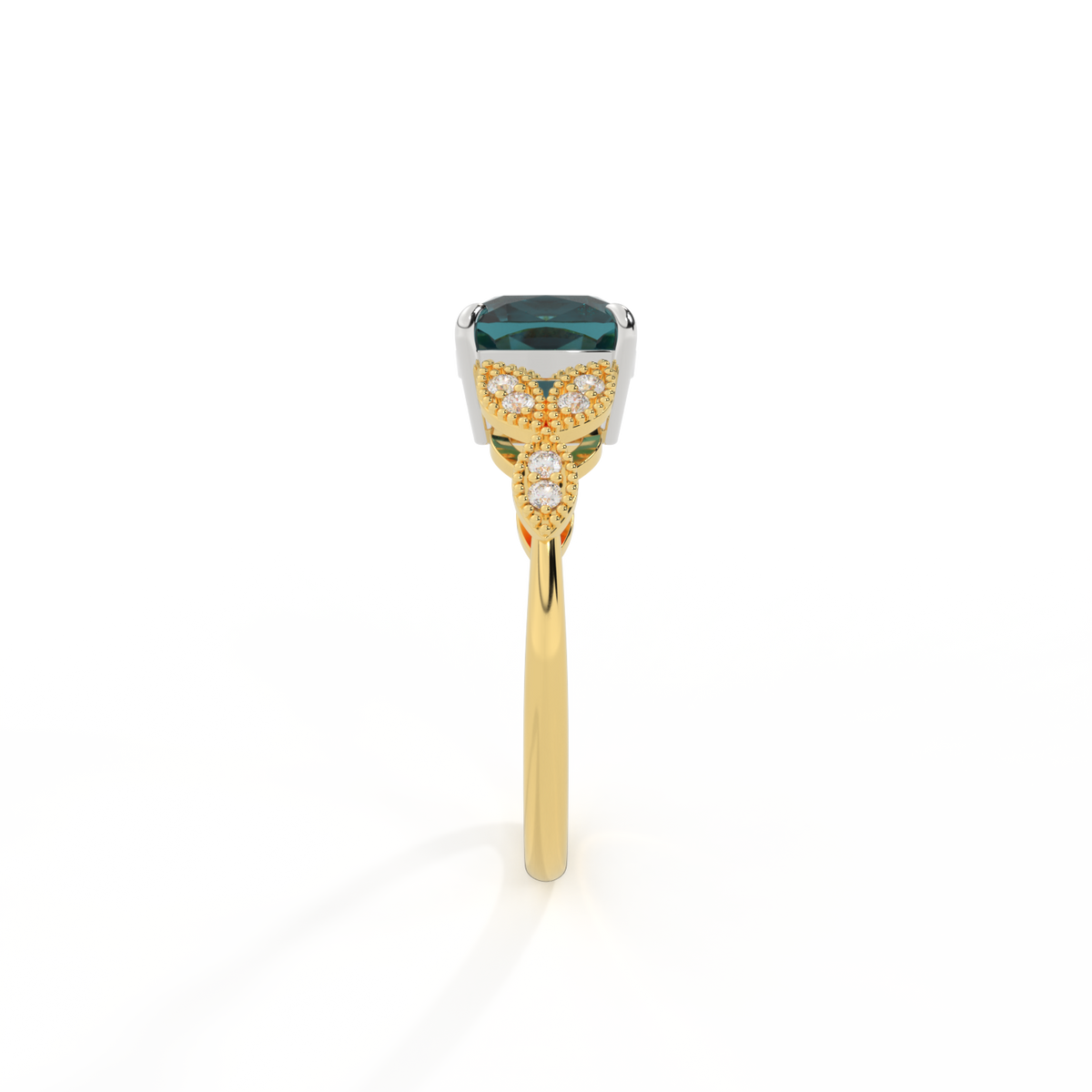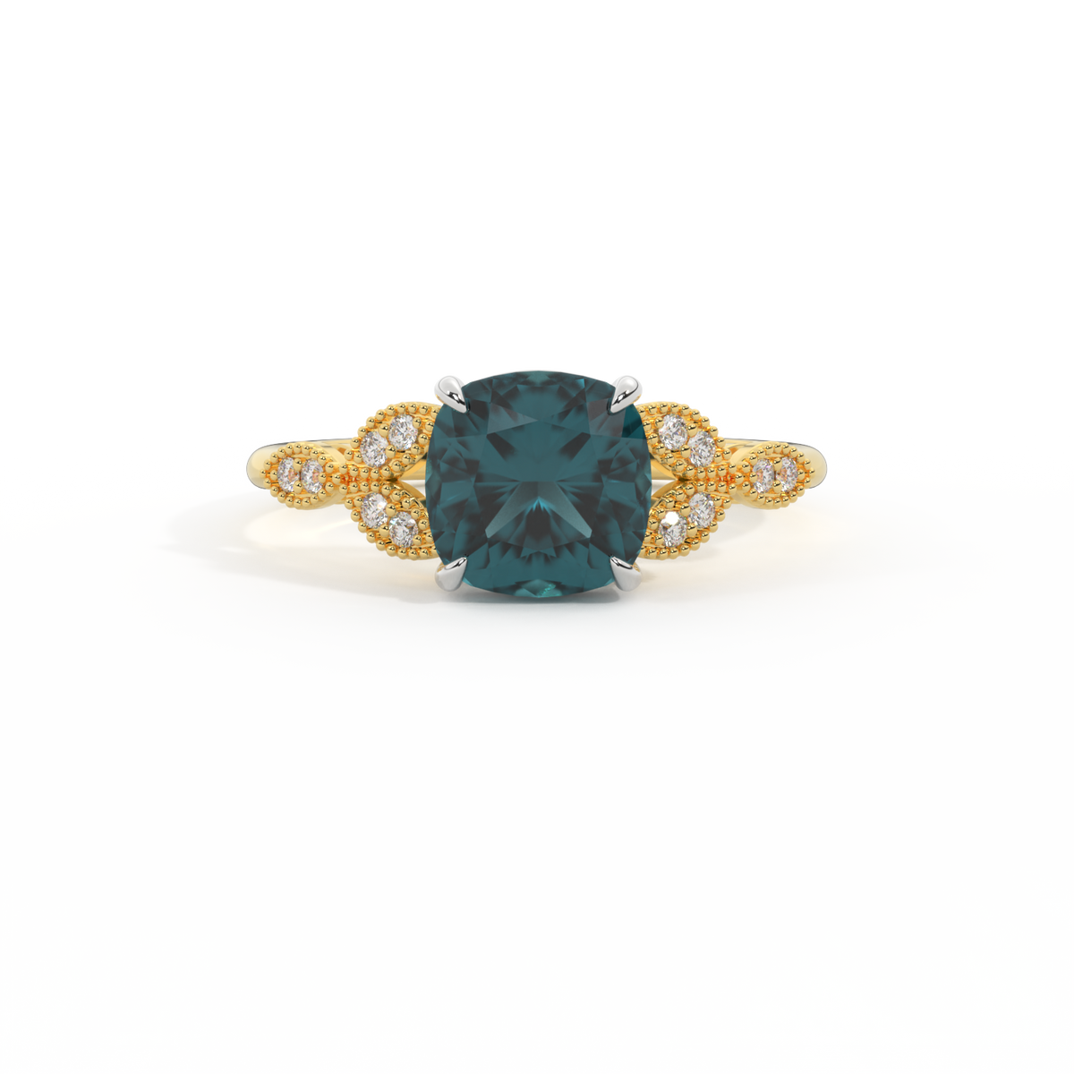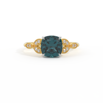 The beauty of a flower, re-imagined for eternity. Inspired by the romance of the Victorian era, this Cushion cut Teal Sapphire is accentuated by a duo of delicate diamond-set petals with millegrain detail for an elegant twist on a timeless classic.