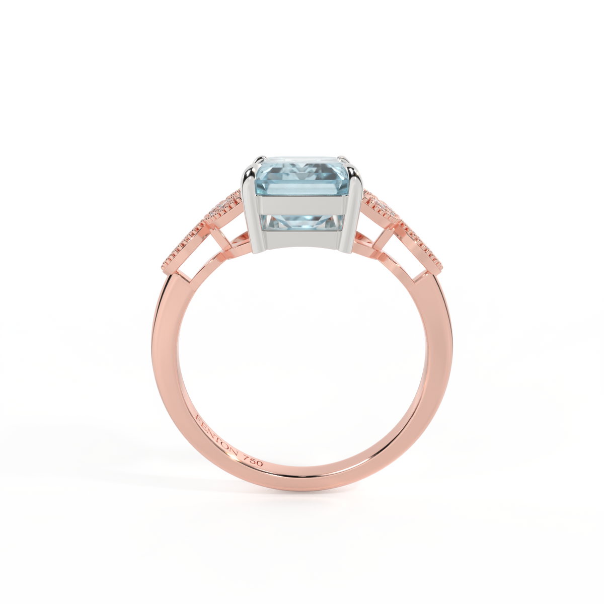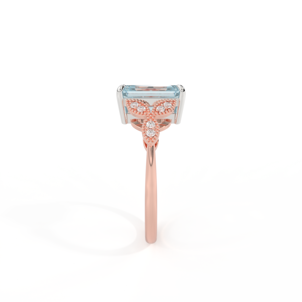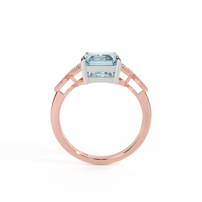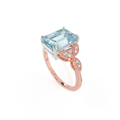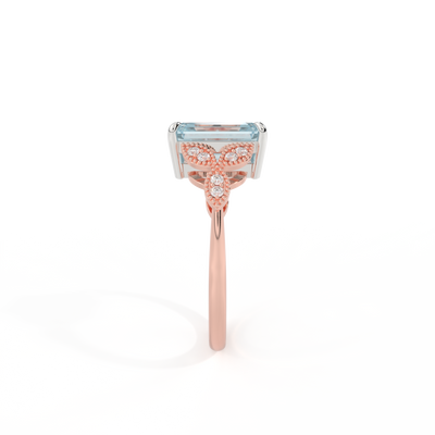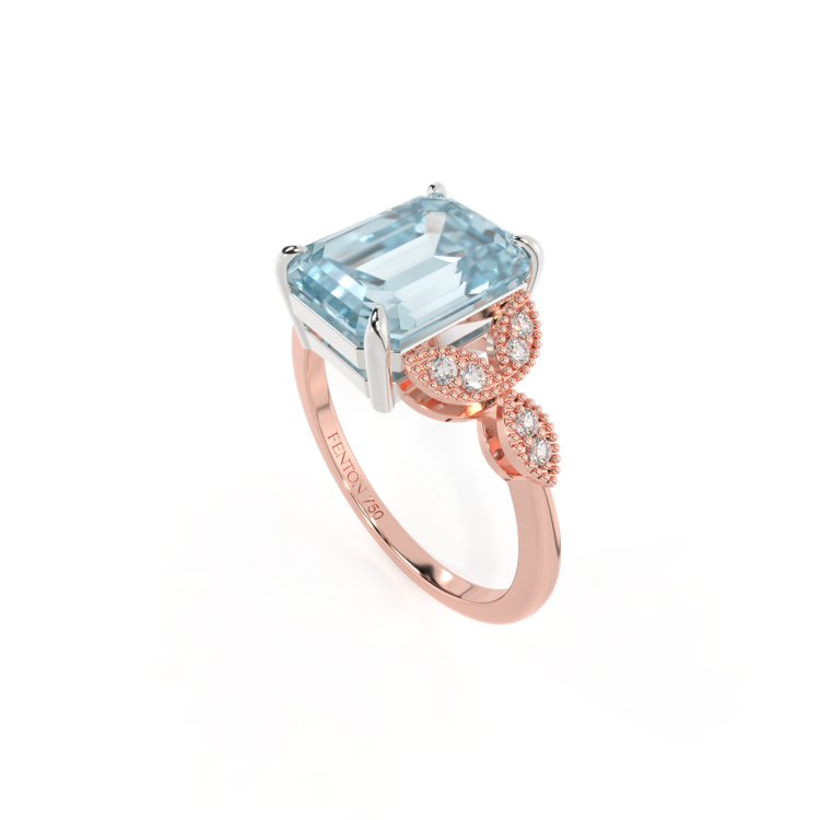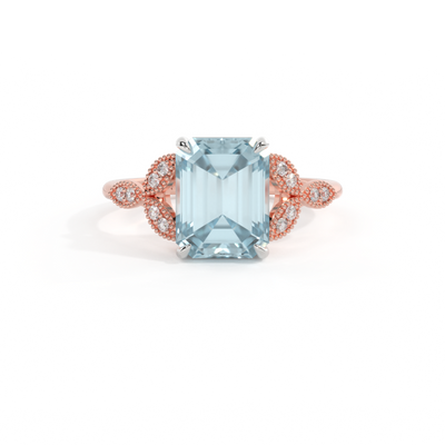 The beauty of a flower, re-imagined for eternity. Inspired by the romance of the Victorian era, this Emerald cut Aquamarine is accentuated by a duo of delicate diamond-set petals with millegrain detail for an elegant twist on a timeless classic.