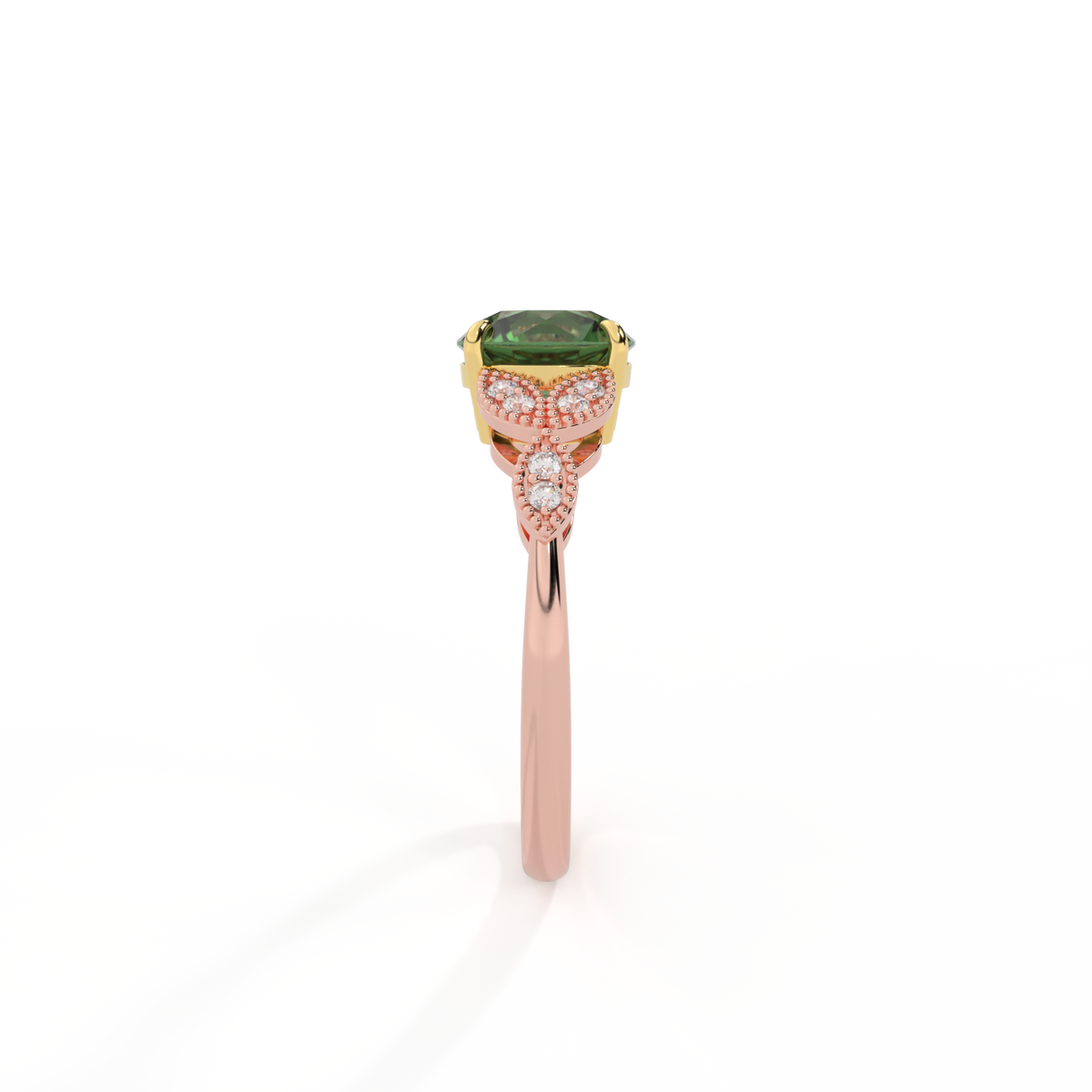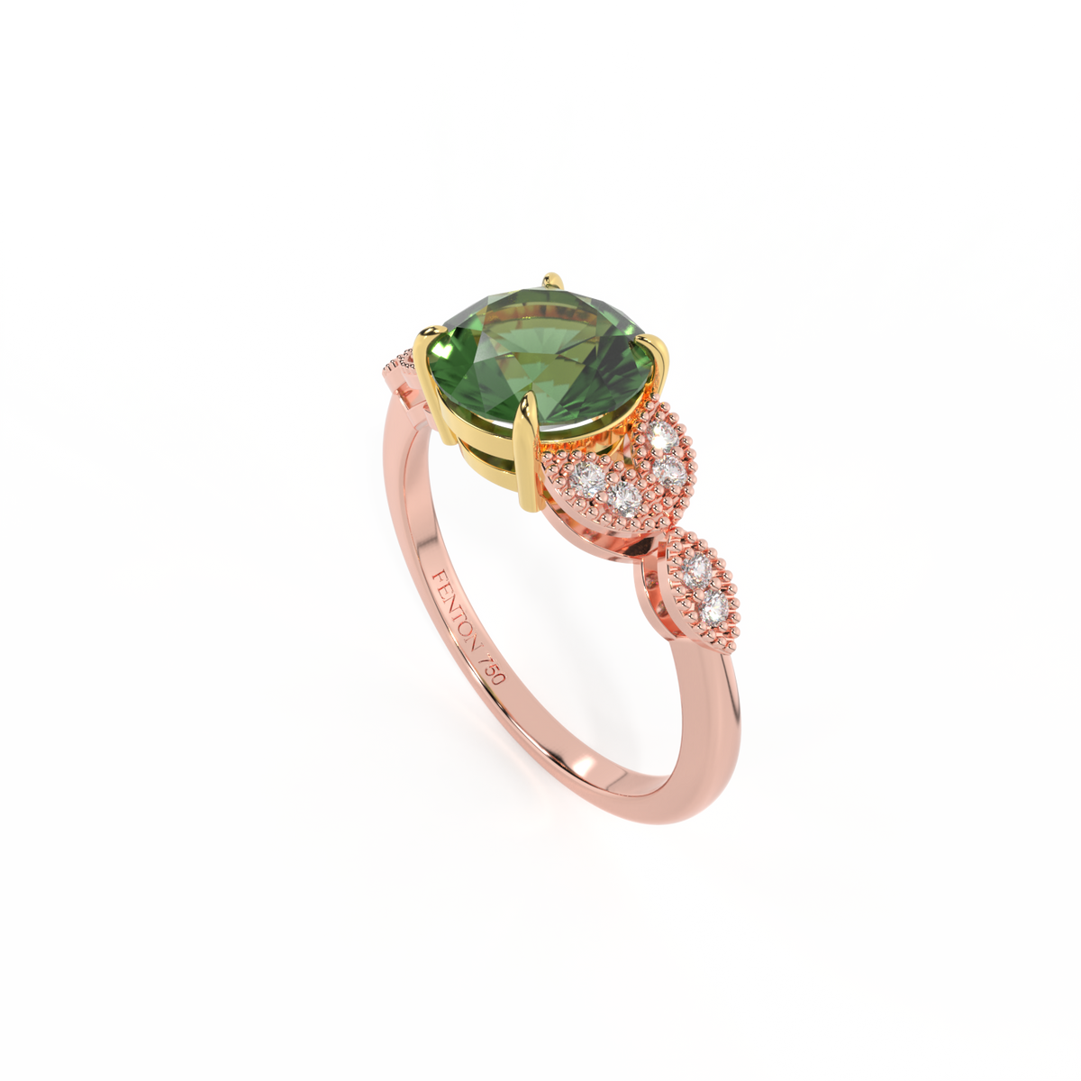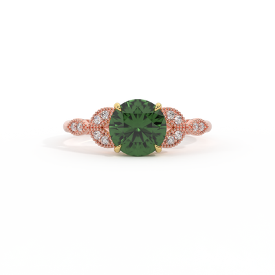 The beauty of a flower, re-imagined for eternity. Inspired by the romance of the Victorian era, this Round cut Green Sapphire is accentuated by a duo of delicate diamond-set petals with millegrain detail for an elegant twist on a timeless classic.