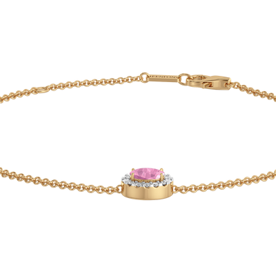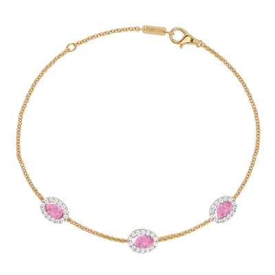 The Garland Bracelet in Pink Sapphire balances feminine romanticism and timeless style. This delicate design features three Oval Pink Sapphire stones in a classic claw setting surrounded by a glistening halo of G/H color and VS clarity diamonds to create a Jewelry piece to be treasured forever. The three-stone design is a Fenton favourite and reminiscent of a floral garland, one of the most universal symbols of love.