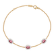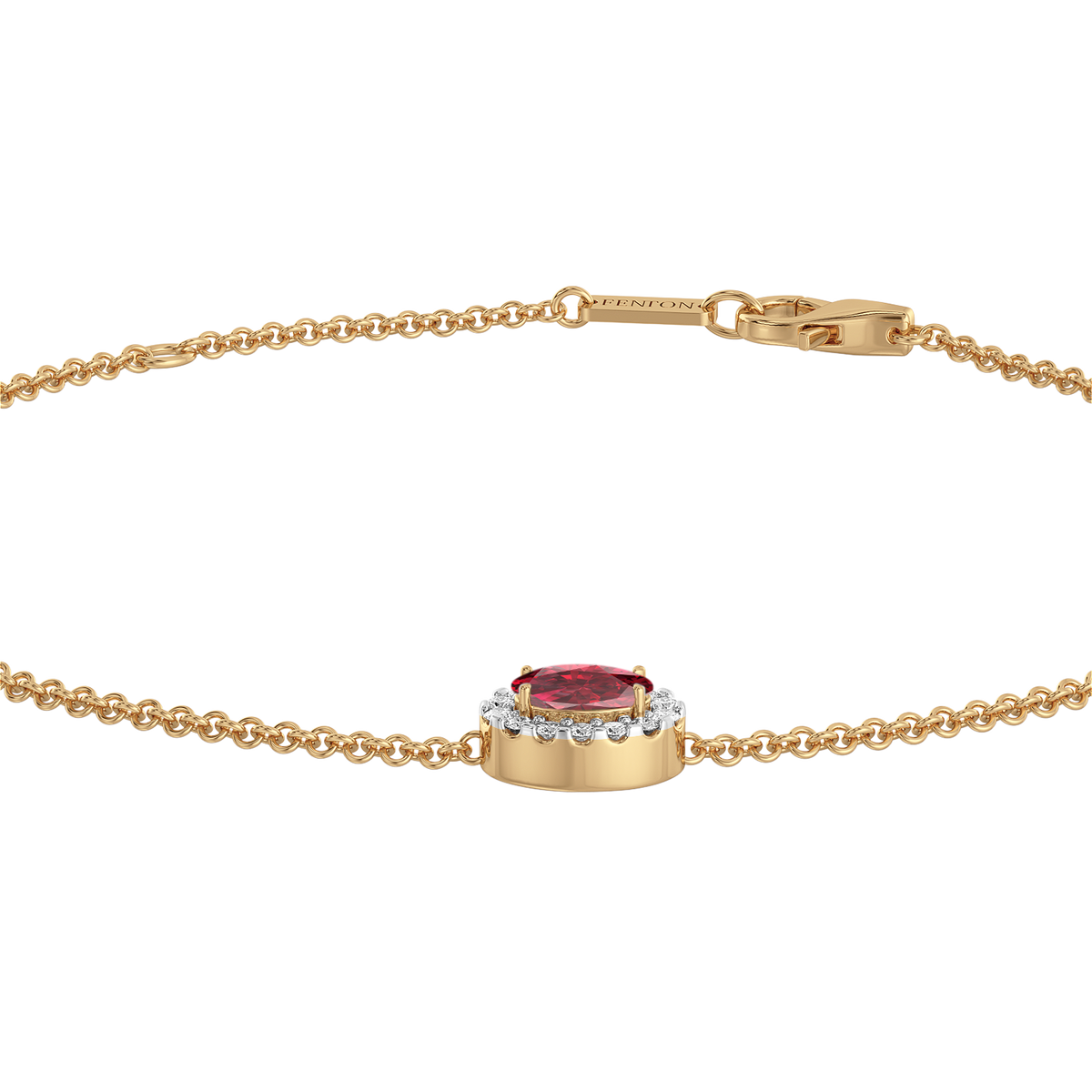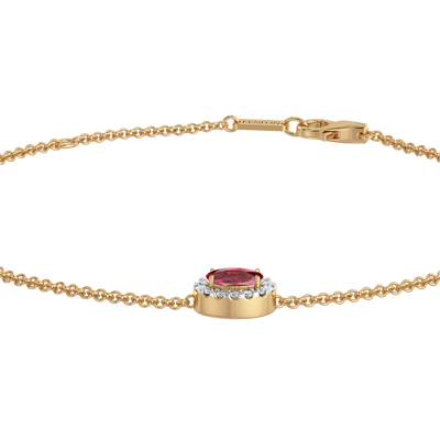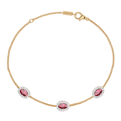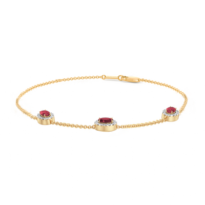 The Garland Bracelet in Ruby balances feminine romanticism and timeless style. This delicate design features three Oval Ruby stones in a classic claw setting surrounded by a glistening halo of G/H color and VS clarity diamonds to create a Jewelry piece to be treasured forever. The three-stone design is a Fenton favourite and reminiscent of a floral garland, one of the most universal symbols of love.