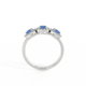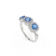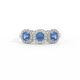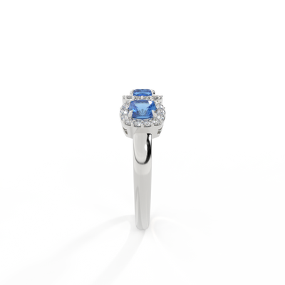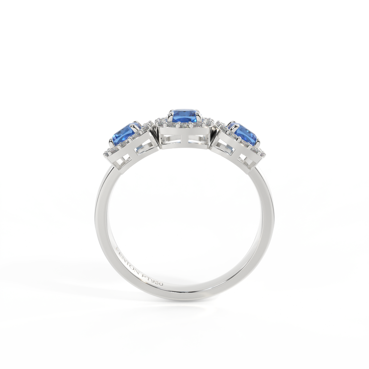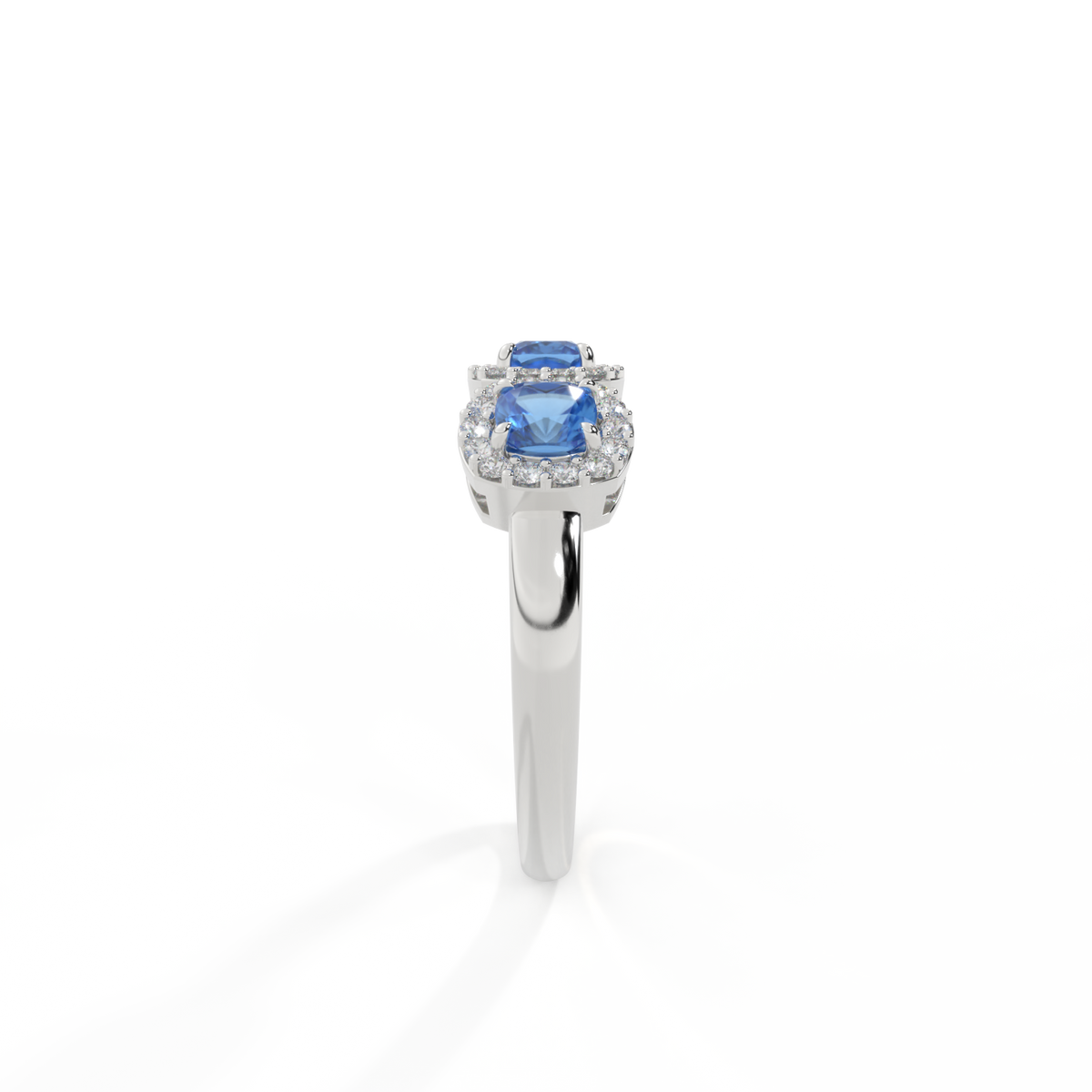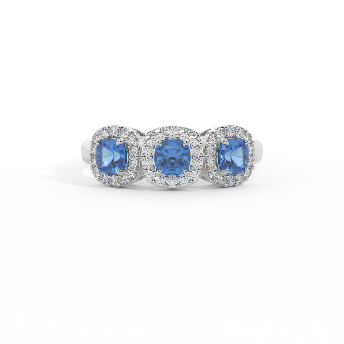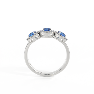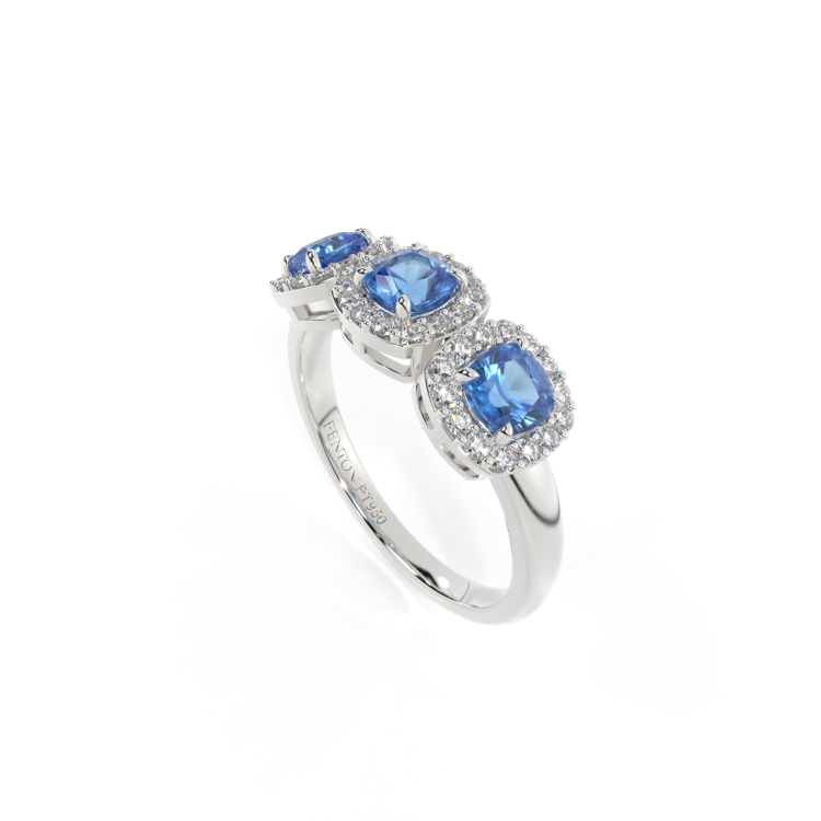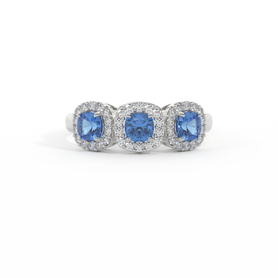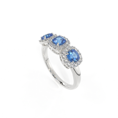 This low set, super wearable beauty, is reminiscent of a floral garland, one of the most universal symbols of love. Three Cushion cut Blue Sapphire stones are surrounded by diamond halos, each stone is completely unique.