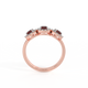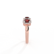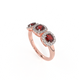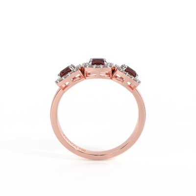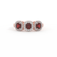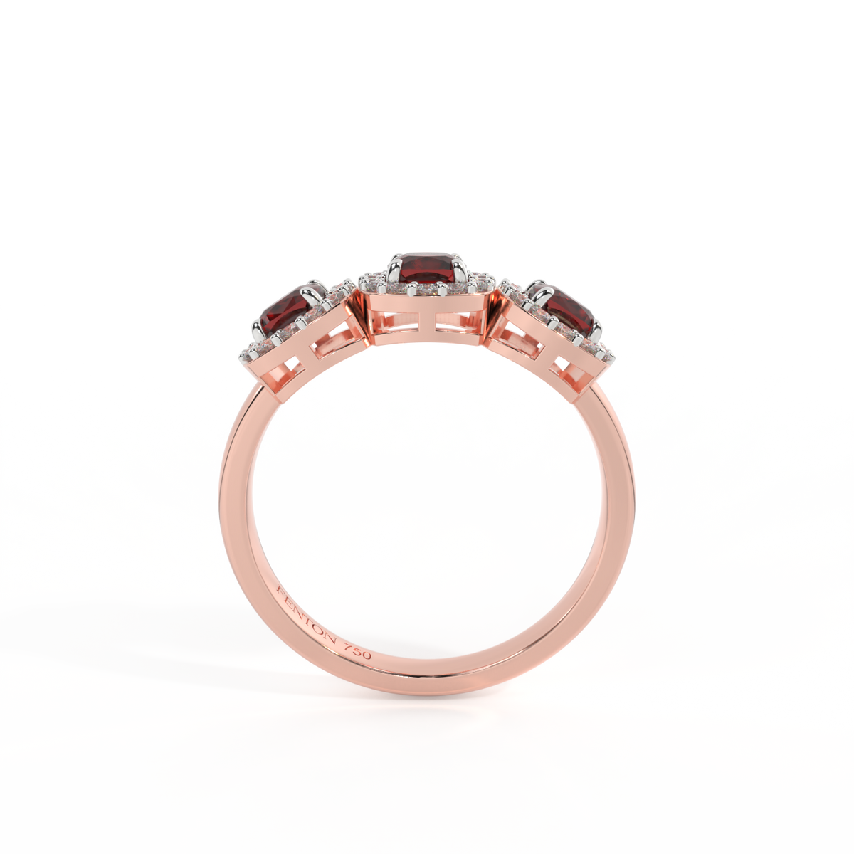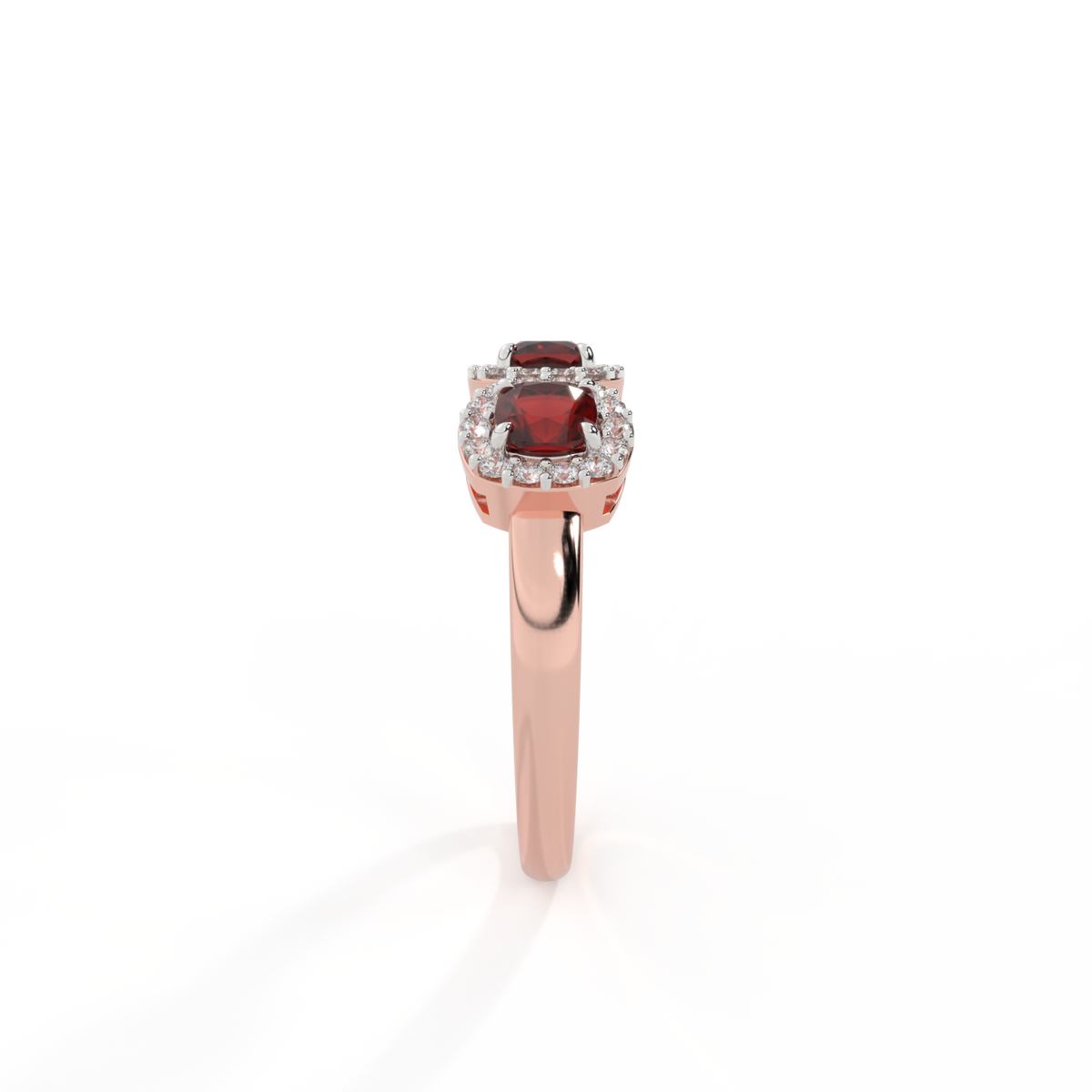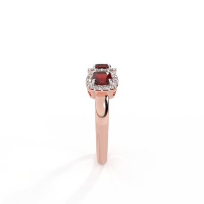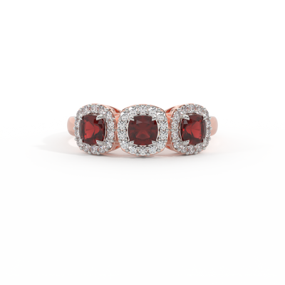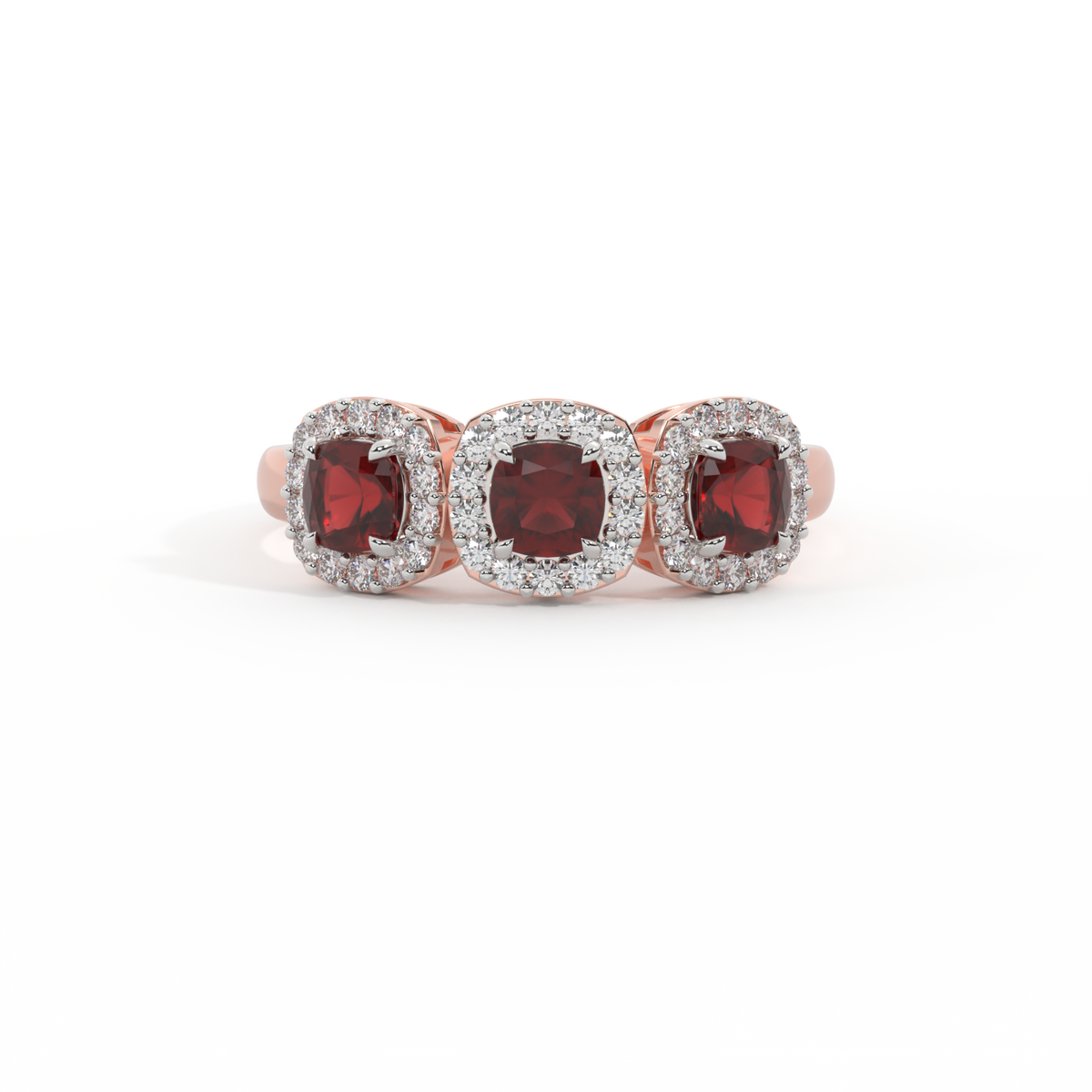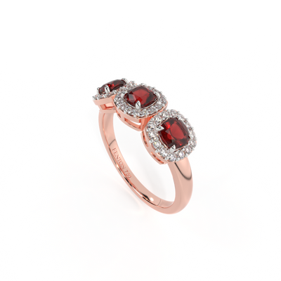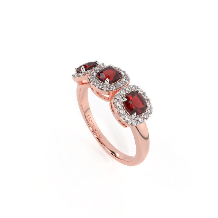 This low set, super wearable beauty, is reminiscent of a floral garland, one of the most universal symbols of love. Three Cushion cut Garnet stones are surrounded by diamond halos, each stone is completely unique.