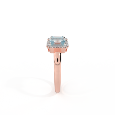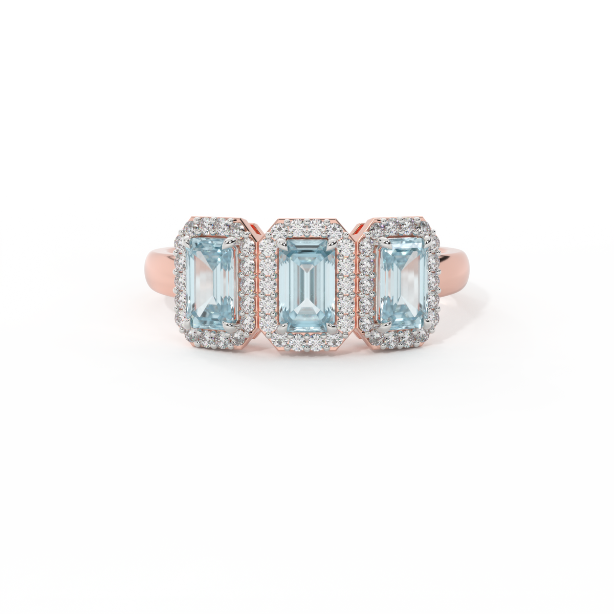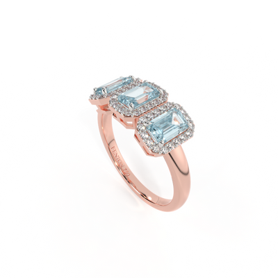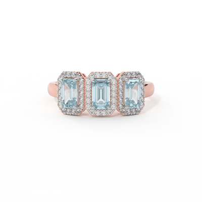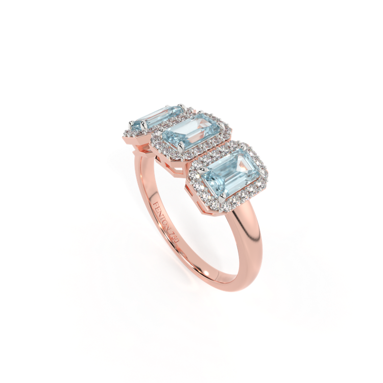 This low set, super wearable beauty, is reminiscent of a floral garland, one of the most universal symbols of love. Three Emerald cut Aquamarine stones are surrounded by diamond halos, each stone is completely unique.